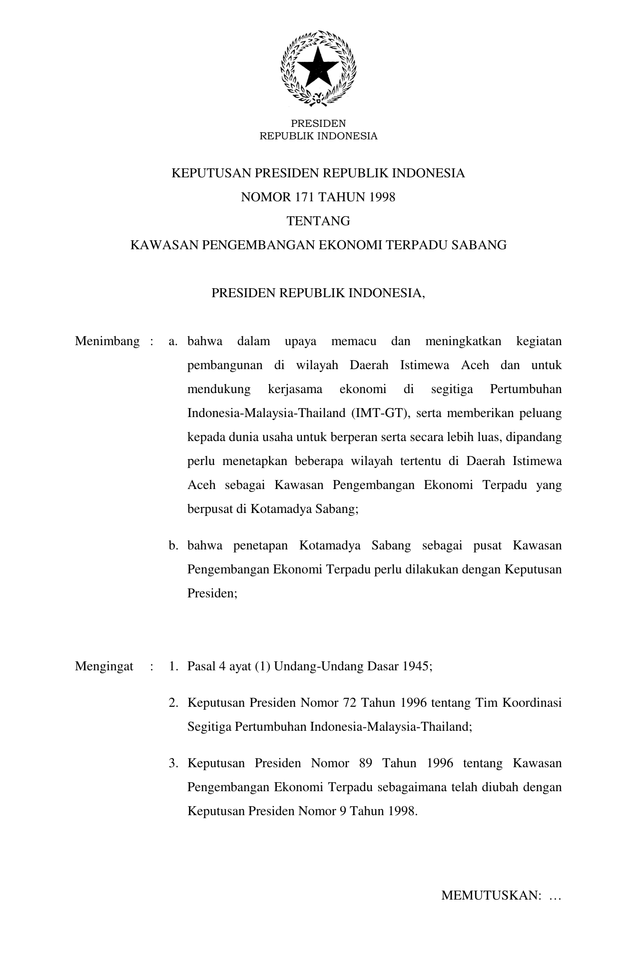 KEPPRES Nomor 171 Tahun 1998 | Keputusan Presiden Nomor 171 Tahun 1998 tentang KAWASAN PENGEMBANGAN EKONOMI TERPADU SABANG