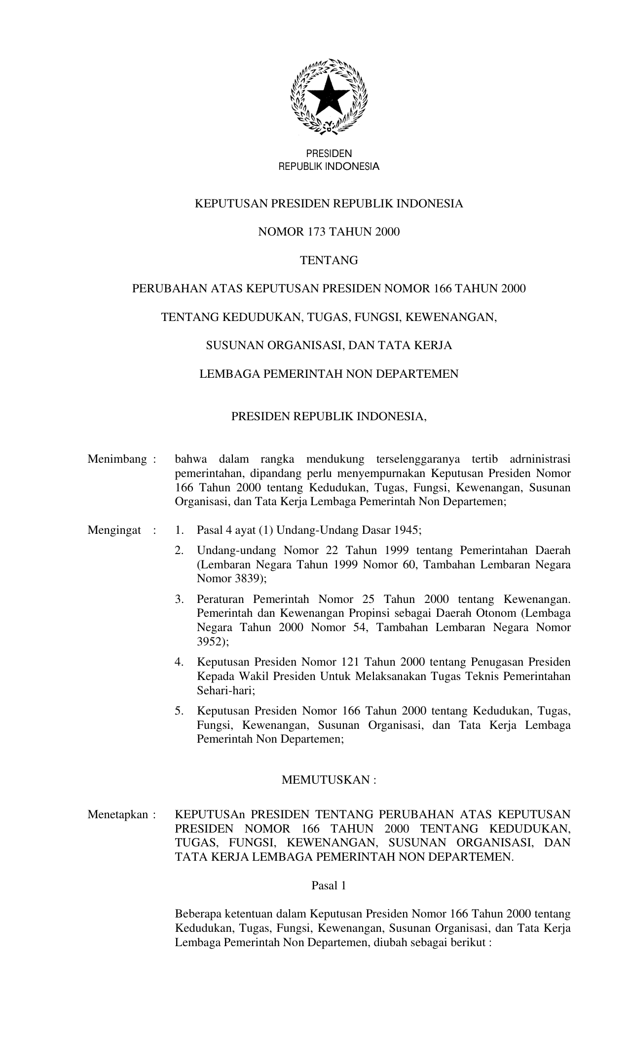 KEPPRES Nomor 173 Tahun 2000 | Keputusan Presiden Nomor 173 Tahun 2000 tentang PERUBAHAN ATAS KEPUTUSAN PRESIDEN NOMOR 166 TAHUN 2000 TENTANG KEDUDUKAN, TUGAS, FUNGSI, KEWENANGAN, SUSUNAN ORGANISASI DAN TATA KERJA LEMBAGA PEMERINTAH NON DEPARTEMEN