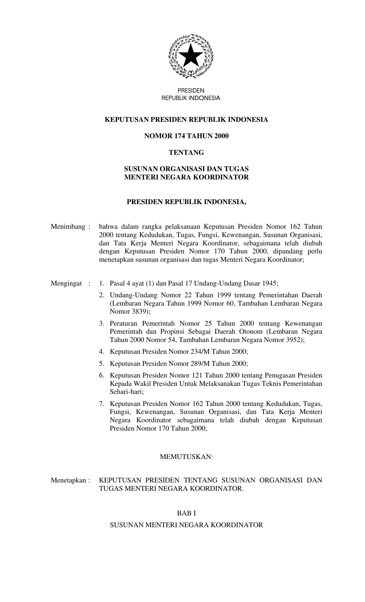 KEPPRES Nomor 174 Tahun 2000 | Keputusan Presiden Nomor 174 Tahun 2000 tentang SUSUNAN ORGANISASI DAN TUGAS MENTERI NEGARA KOORDINATOR