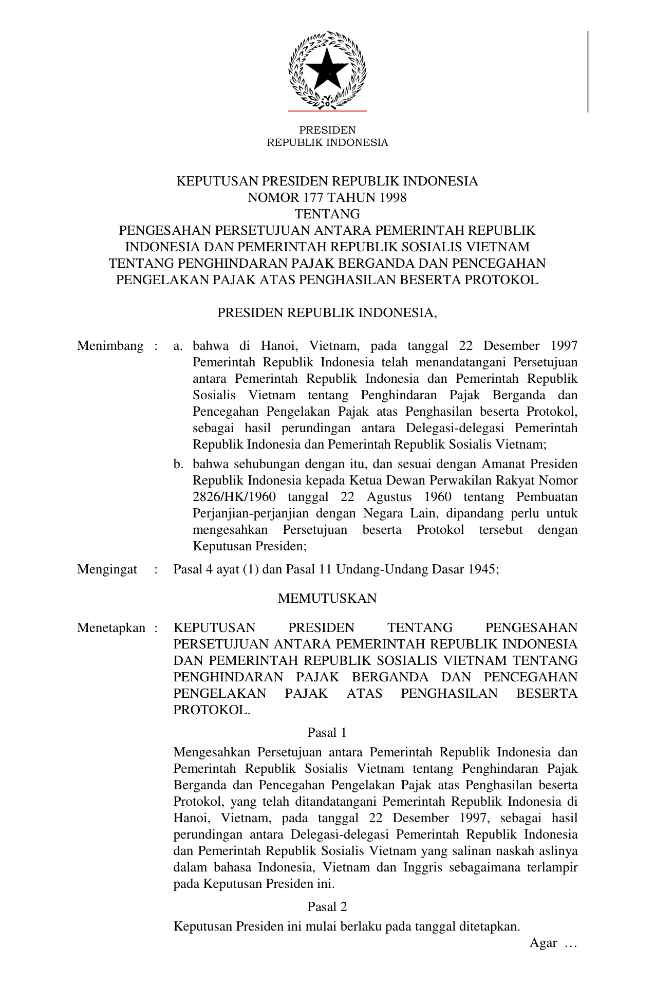 KEPPRES Nomor 177 Tahun 1998 | Keputusan Presiden Nomor 177 Tahun 1998 tentang PENGESAHAN PERSETUJUAN ANTARA PEMERINTAH REPUBLIK INDONESIA DAN PEMERINTAH REPUBLIK SOSIALIS VIETNAM TENTANG PENGHINDARAN PAJAK BERGANDA DAN PENCEGAHAN PENGELAKAN PAJAK ATAS PENGHASILAN BESERTA PROTOKOL