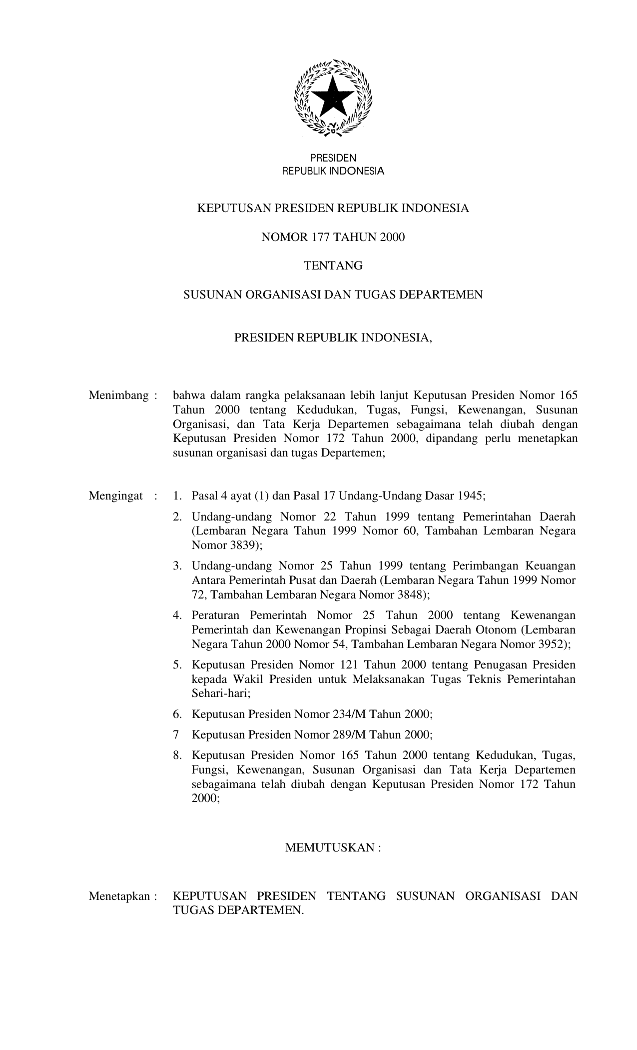 KEPPRES Nomor 177 Tahun 2000 | Keputusan Presiden Nomor 177 Tahun 2000 tentang SUSUNAN ORGANISASI DAN TUGAS DEPARTEMEN