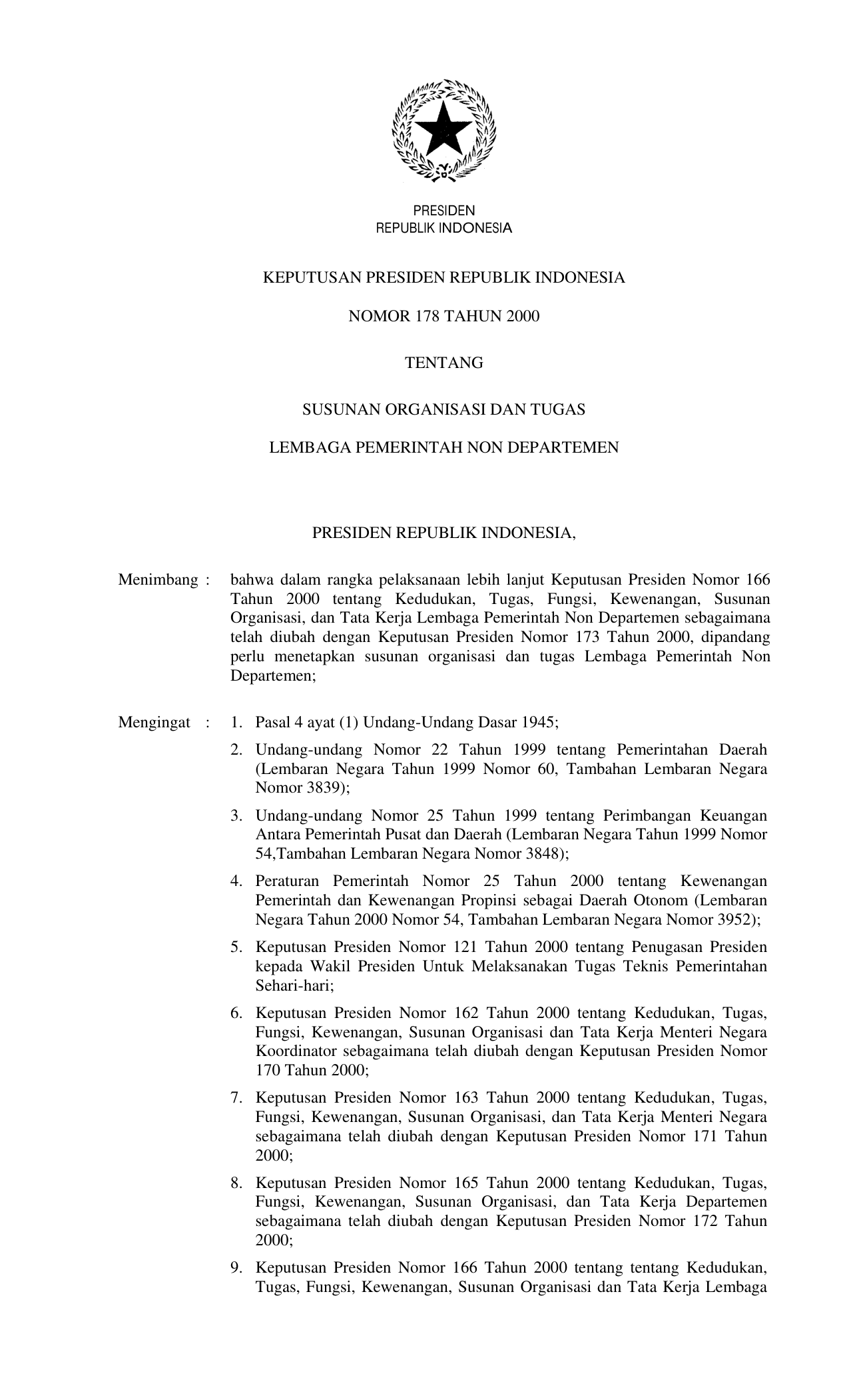 KEPPRES Nomor 178 Tahun 2000 | Keputusan Presiden Nomor 178 Tahun 2000 tentang SUSUNAN ORGANISASI DAN TUGAS LEMBAGA PEMERINTAH NON DEPARTEMEN