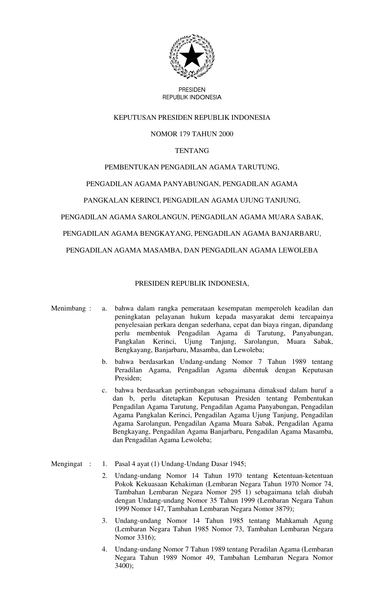 KEPPRES Nomor 179 Tahun 2000 | Keputusan Presiden Nomor 179 Tahun 2000 tentang PEMBENTUKAN PENGADILAN AGAMA TARUTUNG, PENGADILAN AGAMA PANYABUNGAN, PENGADILAN AGAMA PANGKALAN KERINCI, PENGADILAN AGAMA UJUNG TANJUNG, PENGADILAN AGAMA SAROLANGUN, PENGADILAN AGAMA MUARA SABAK, PENGADILAN AGAMA BENGKAYANG, PENGADILAN AGAMA BANJARBARU, PENGADILAN AGAMA MASAMBA, DAN PENGADILAN AGAMA LEWOLEBA