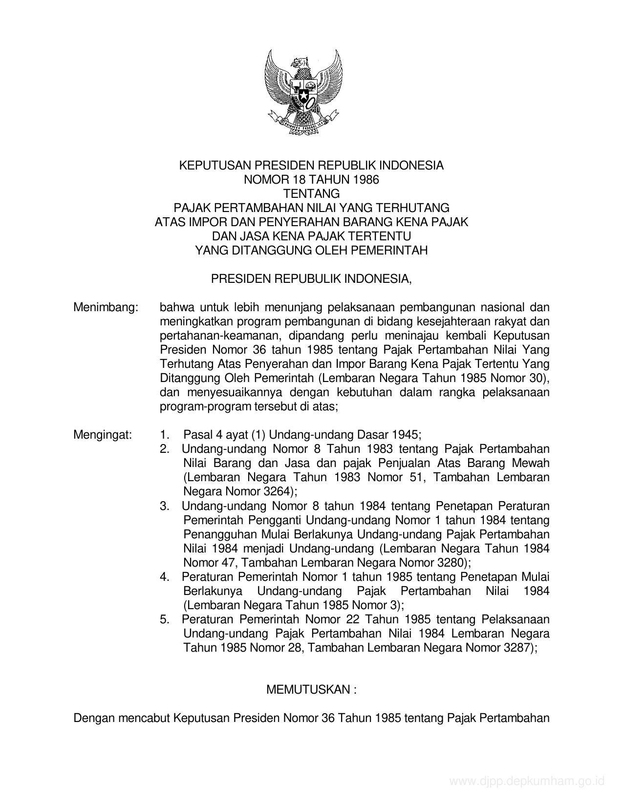 KEPPRES Nomor 18 Tahun 1986 | Keputusan Presiden Nomor 18 Tahun 1986 tentang PAJAK PERTAMBAHAN NILAI YANG TERHUTANG ATAS IMPOR DAN PENYERAHAN BARANG KENA PAJAK DAN JASA KENA TER