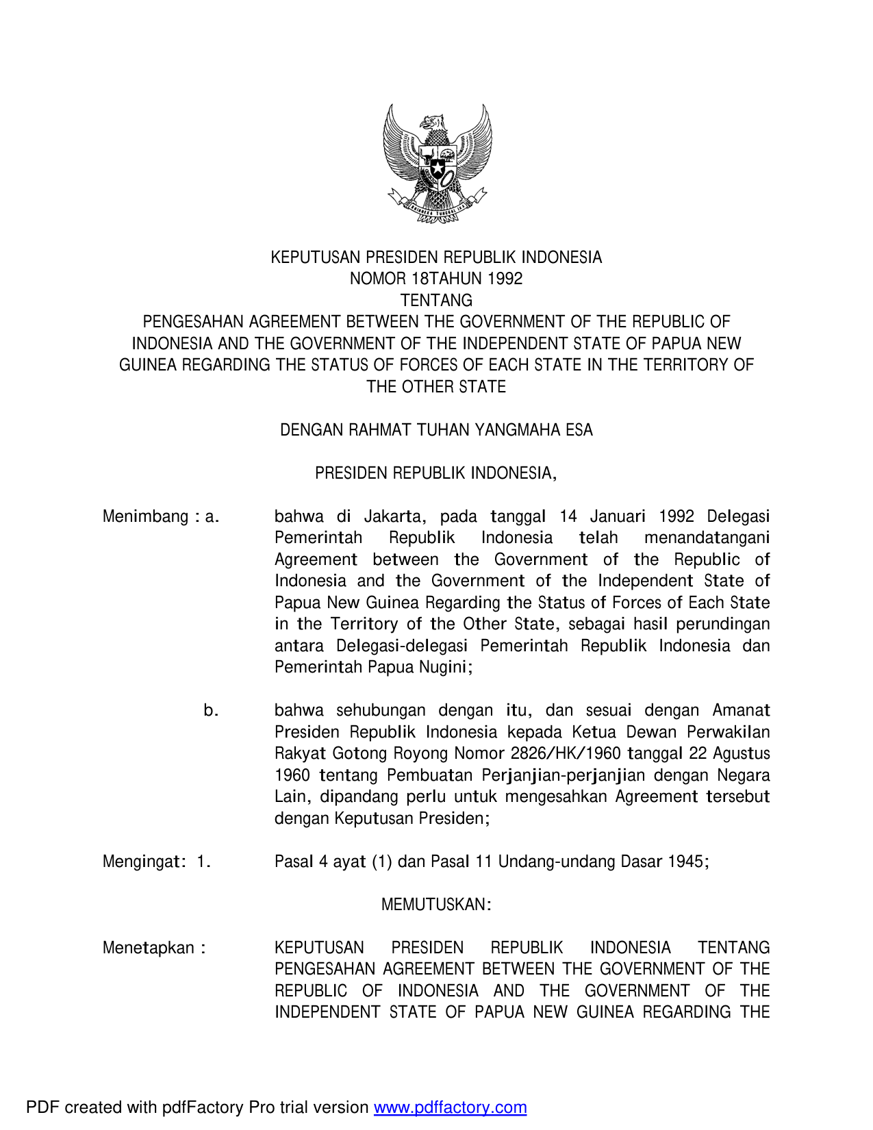 KEPPRES Nomor 18 Tahun 1992 | Keputusan Presiden Nomor 18 Tahun 1992 tentang PENGESAHAN AGREEMENT BETWEEN THE GOVERMENT OF THE REPUBLIC OF INDONESIA AND THE GOVERMENT OF THE INDEPENDENT STATE OF PAPUA NEW GUINEA REGARDING THE STATUS OF FORCE OF EACH STATE IN THE TERRITORY OF THE OTHER STATE