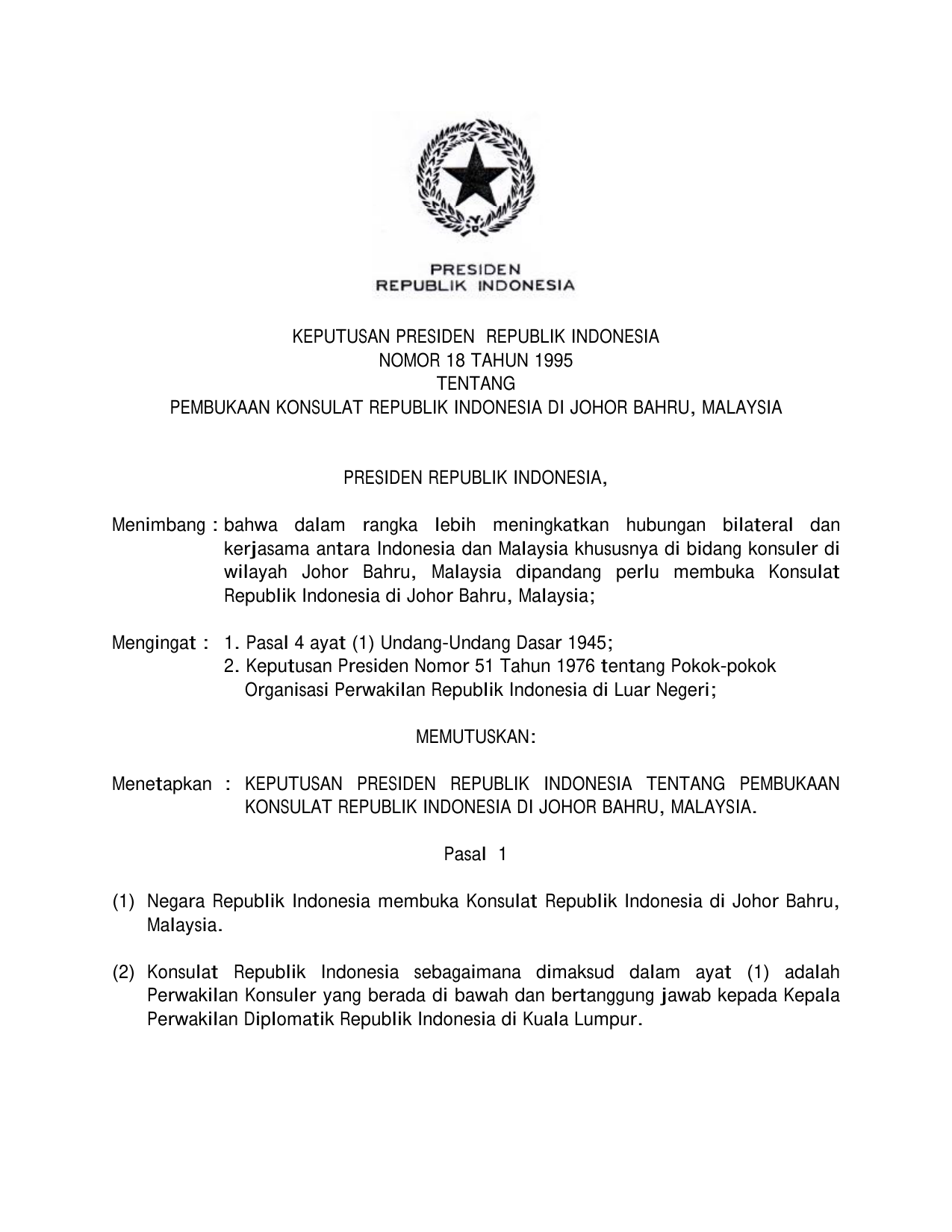 KEPPRES Nomor 18 Tahun 1995 | Keputusan Presiden Nomor 18 Tahun 1995 tentang PEMBUKAAN KONSULAT RI DI JOHOR BARU MALAYSIA