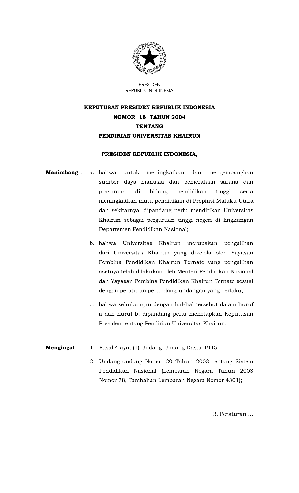 KEPPRES Nomor 18 Tahun 2004 | Keputusan Presiden Nomor 18 Tahun 2004 tentang PENDIRIAN UNIVERSITAS KHAIRUN