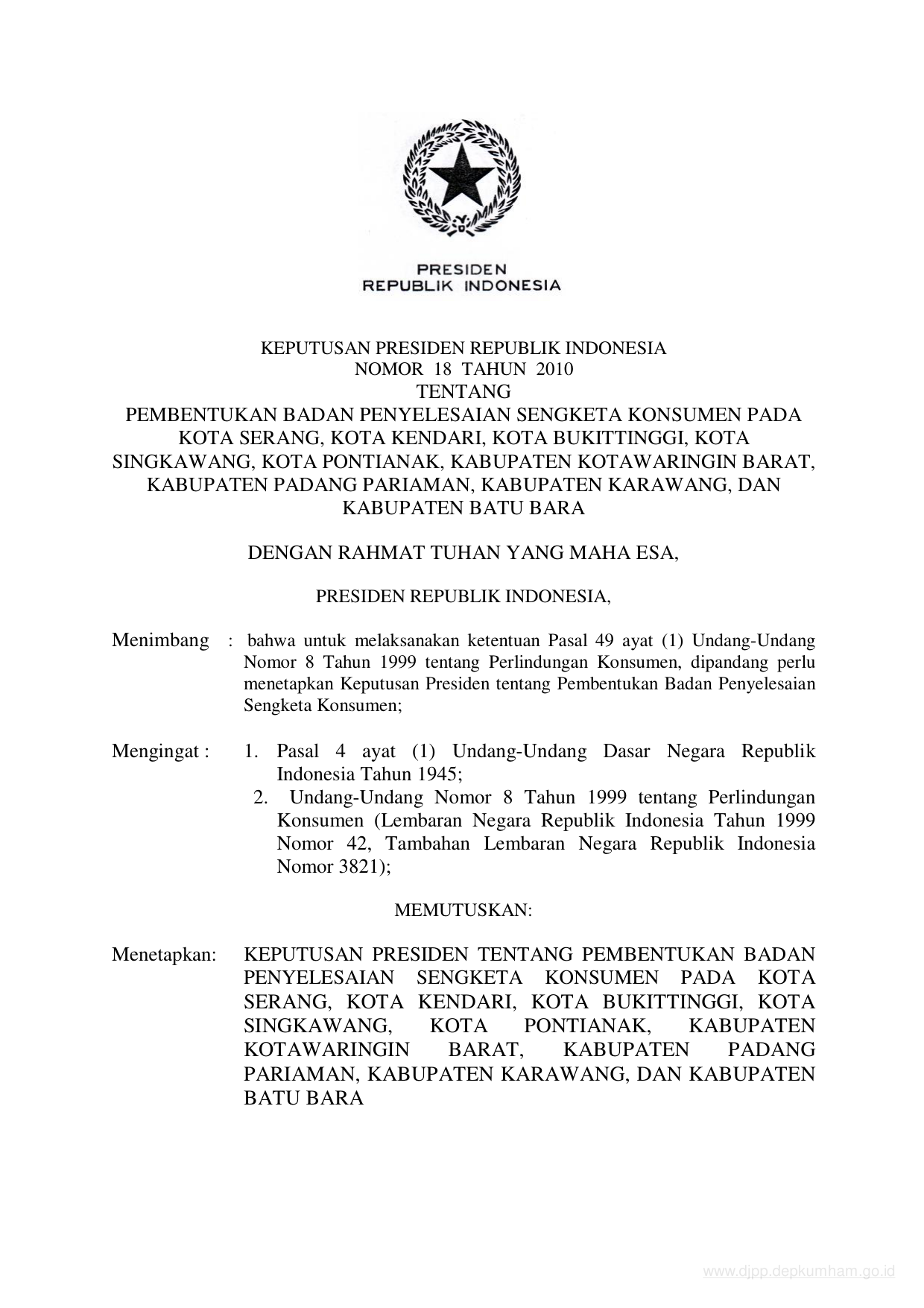 KEPPRES Nomor 18 Tahun 2010 | Keputusan Presiden Nomor 18 Tahun 2010 tentang PEMBENTUKAN BADAN PENYELESAIAN SENGKETA KONSUMEN PADA KOTA SERANG, KOTA KENDARI, KOTA BUKITTINGGI, KOTA SINGKAWANG, KOTA PONTIANAK, KABUPATEN KOTAWARINGIN BARAT, KABUPATEN PADANG PARIAMAN, KABUPATEN KARAWANG, DAN KABUPATEN BATU BARA