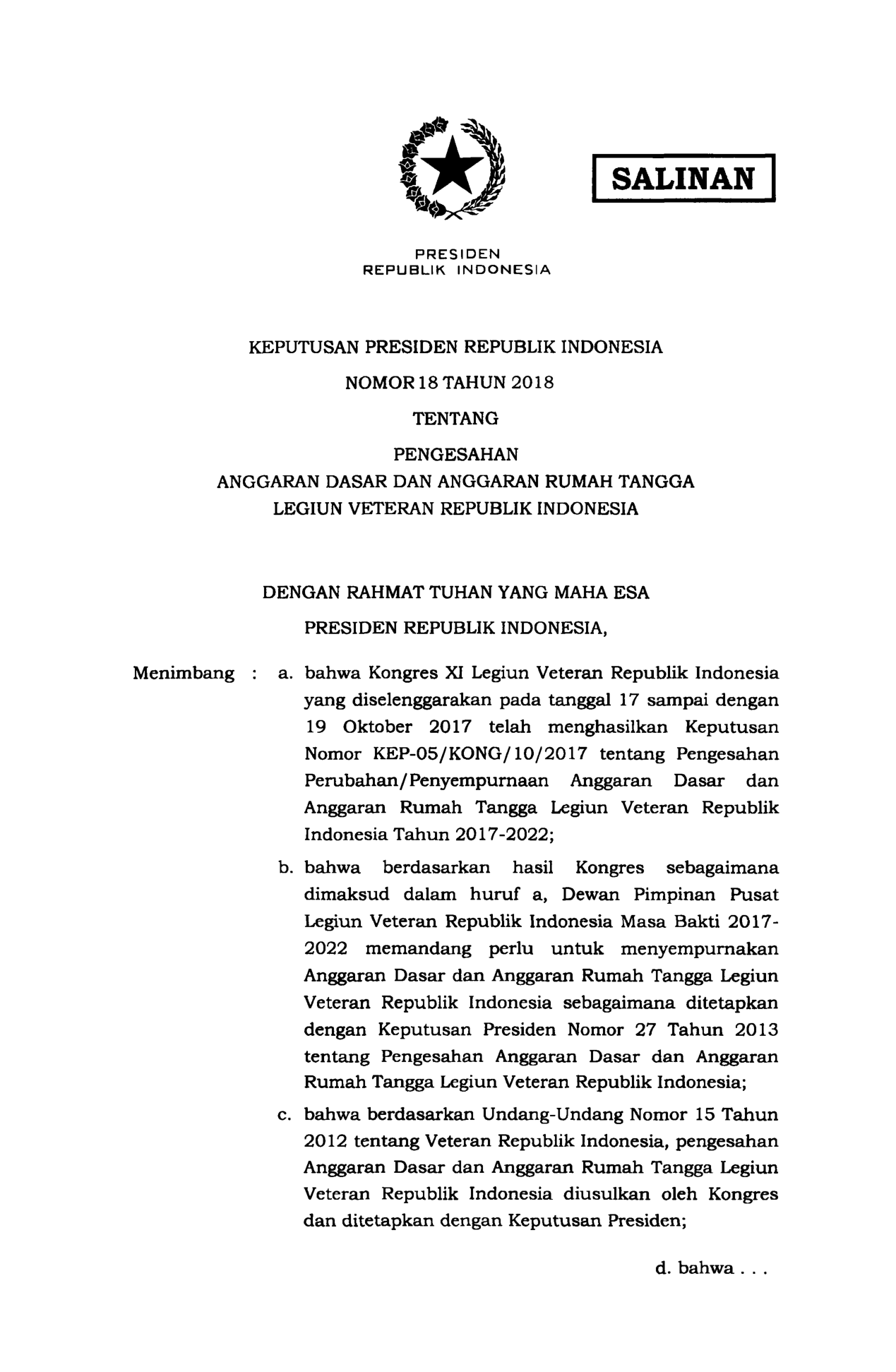 KEPPRES Nomor 18 Tahun 2018 | Keputusan Presiden Nomor 18 Tahun 2018 tentang PENGESAHAN ANGGARAN DASAR DAN ANGGARAN RUMAH TANGGA LEGIUN VETERAN REPUBLIK INDONESIA