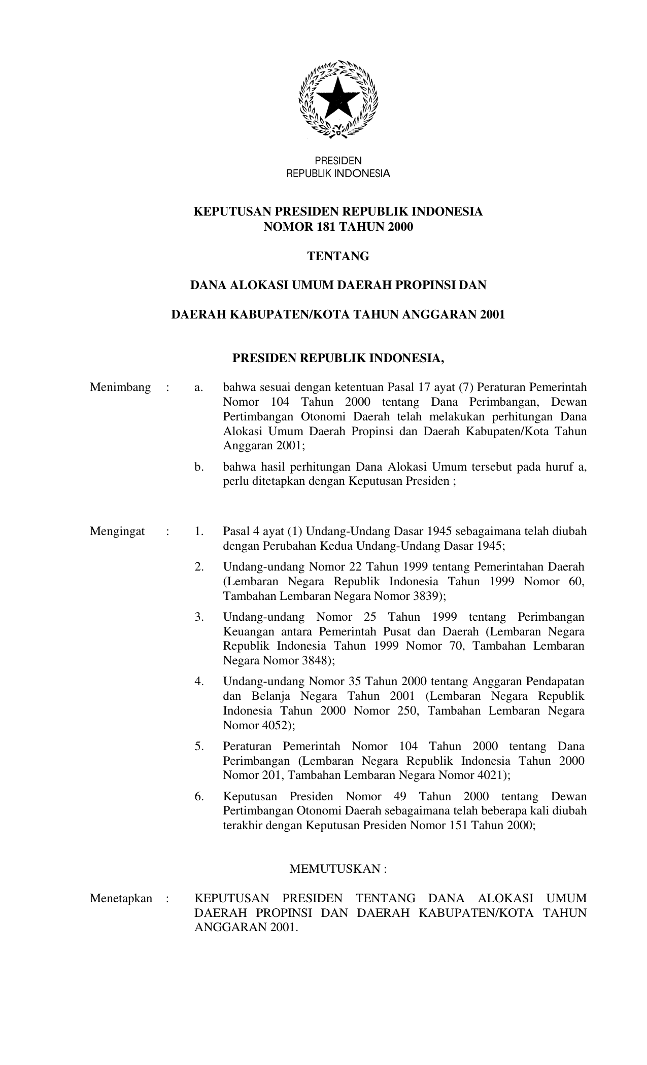 KEPPRES Nomor 181 Tahun 2000 | Keputusan Presiden Nomor 181 Tahun 2000 tentang DANA ALOKASI UMUM DAERAH PROPINSI DAN DAERAH KABUPATEN/KOTA TAHUN ANGGARAN 2001