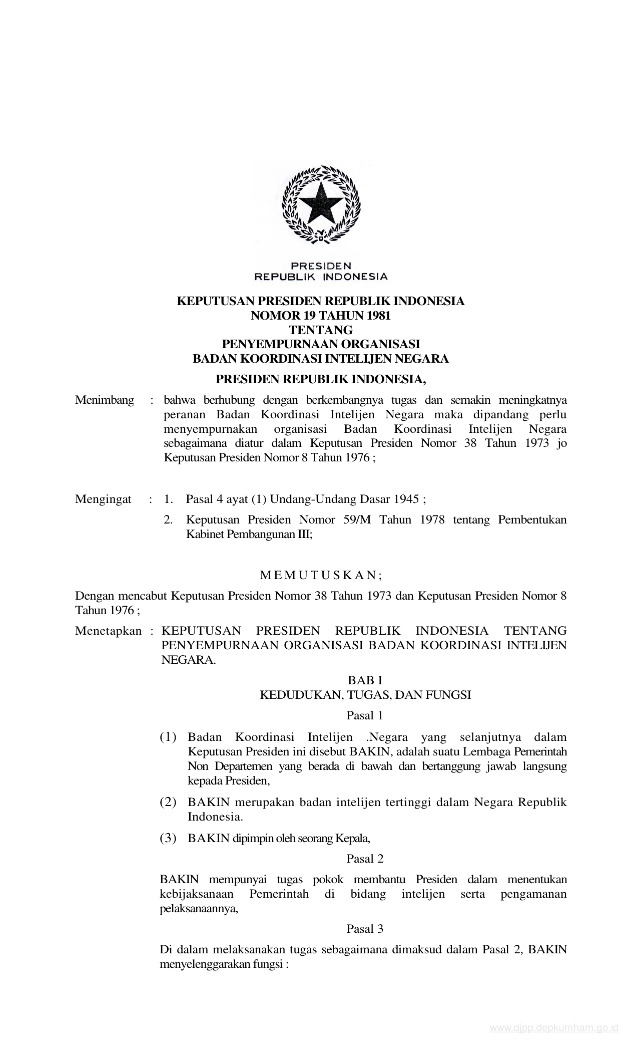 KEPPRES Nomor 19 Tahun 1981 | Keputusan Presiden Nomor 19 Tahun 1981 tentang PENYEMPURNAAN ORGANISASI BADAN KOORDINASI INTELIJEN NEGARA