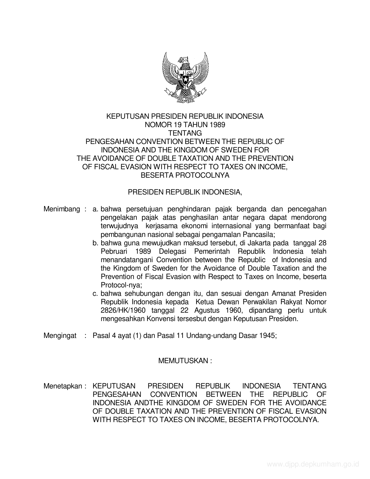 KEPPRES Nomor 19 Tahun 1989 | Keputusan Presiden Nomor 19 Tahun 1989 tentang PENGESAHAN CONVENTION BETWEEN THE REPUBLIC OF INDONESIA AND THE KINGDOM SWEDEN FOR THE AVOIDANCE DOUBLE AND THE PREVENTATION OF FISCAL EVASION WITH RESPECT TO TAXES ON INCOME, BESERTA PROTOKOLNYA
