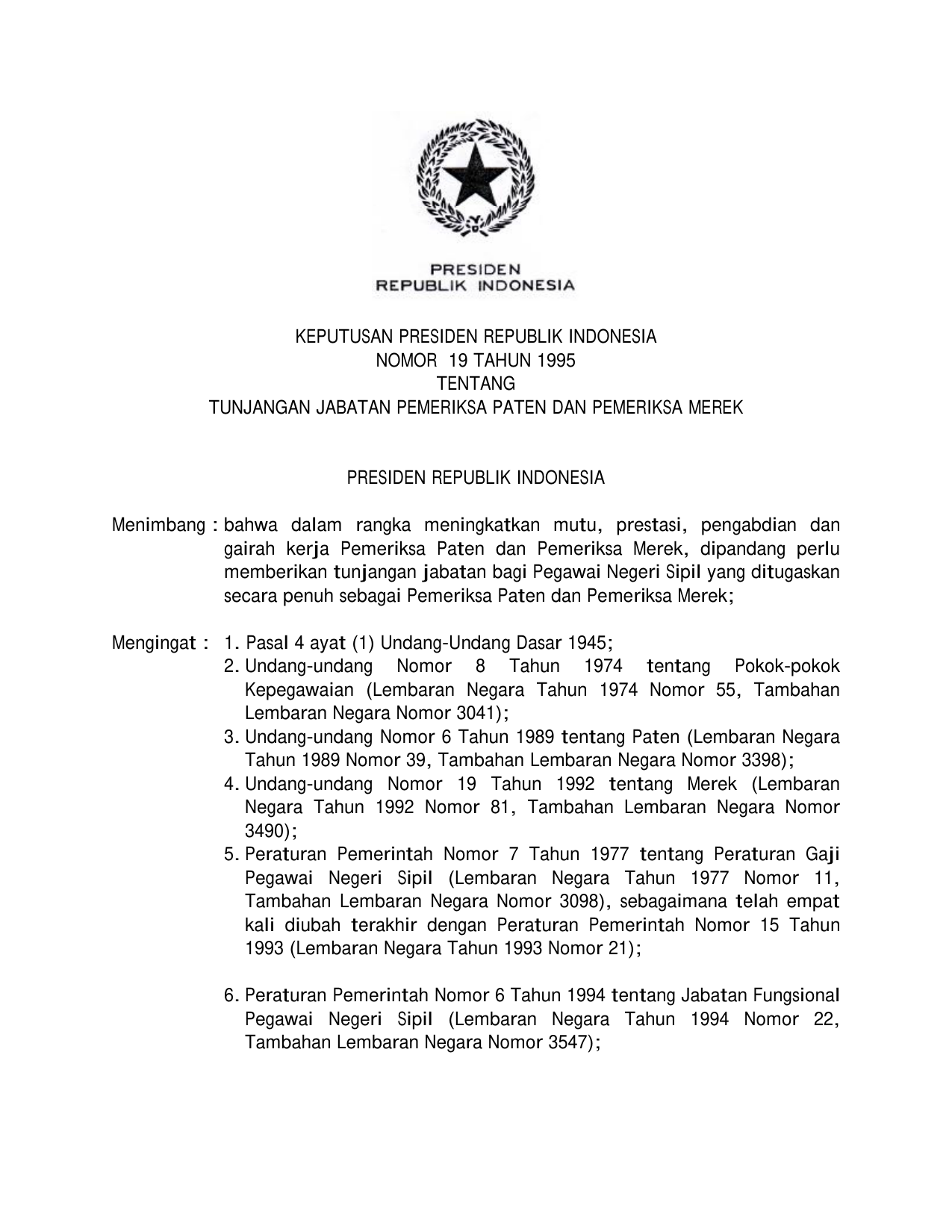 KEPPRES Nomor 19 Tahun 1995 | Keputusan Presiden Nomor 19 Tahun 1995 tentang TUNJANGAN JABATAN PEMERIKSA PATEN DAN PEMERIKSA MEREK