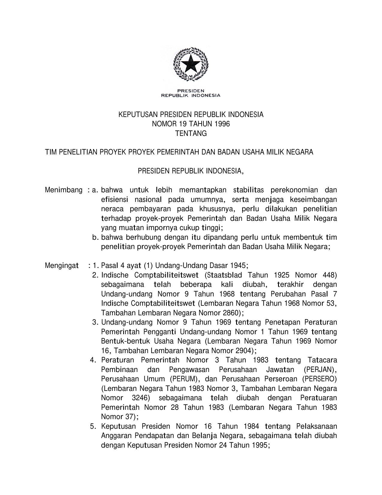KEPPRES Nomor 19 Tahun 1996 | Keputusan Presiden Nomor 19 Tahun 1996 tentang TIM PENELITIAN PROYEK PEMERINTAHAN DAN BADAN USAHA MILIK NEGARA