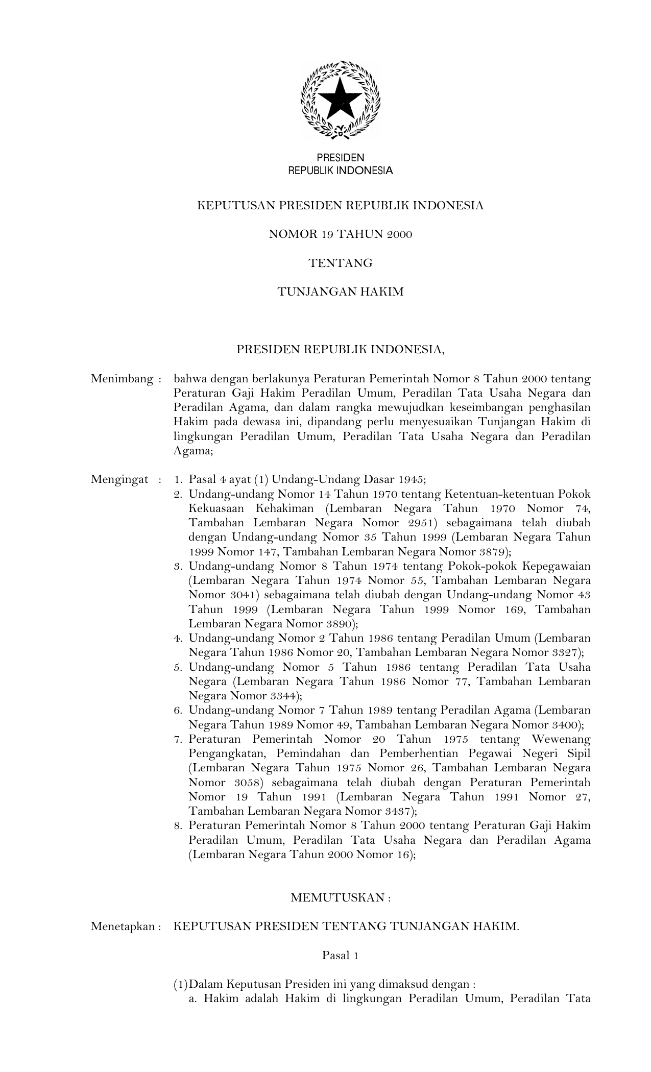 KEPPRES Nomor 19 Tahun 2000 | Keputusan Presiden Nomor 19 Tahun 2000 tentang TUNJANGAN HAKIM