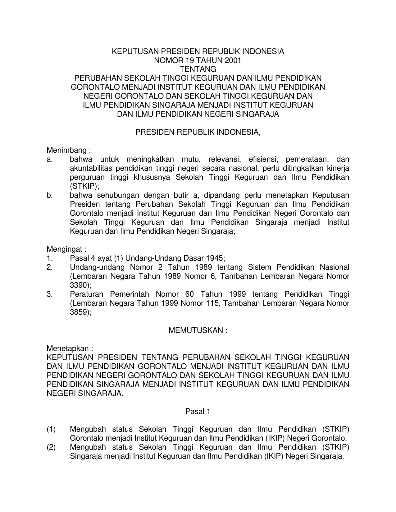 KEPPRES Nomor 19 Tahun 2001 | Keputusan Presiden Nomor 19 Tahun 2001 tentang PERUBAHAN SEKOLAH TINGGI KEGURUAN DAN ILMU PENDIDIKAN GORONTALO MENJADI INSTITUT KEGURUAN DAN ILMU PENDIDIKAN NEGERI GORONTALO DAN SEKOLAH TINGGI KEGURUAN DAN ILMU PENDIDIKAN SINGARAJA MENJADI INSTITUT KEGURUAN DAN ILMU PENDIDIKAN NEGERI SINGARAJA