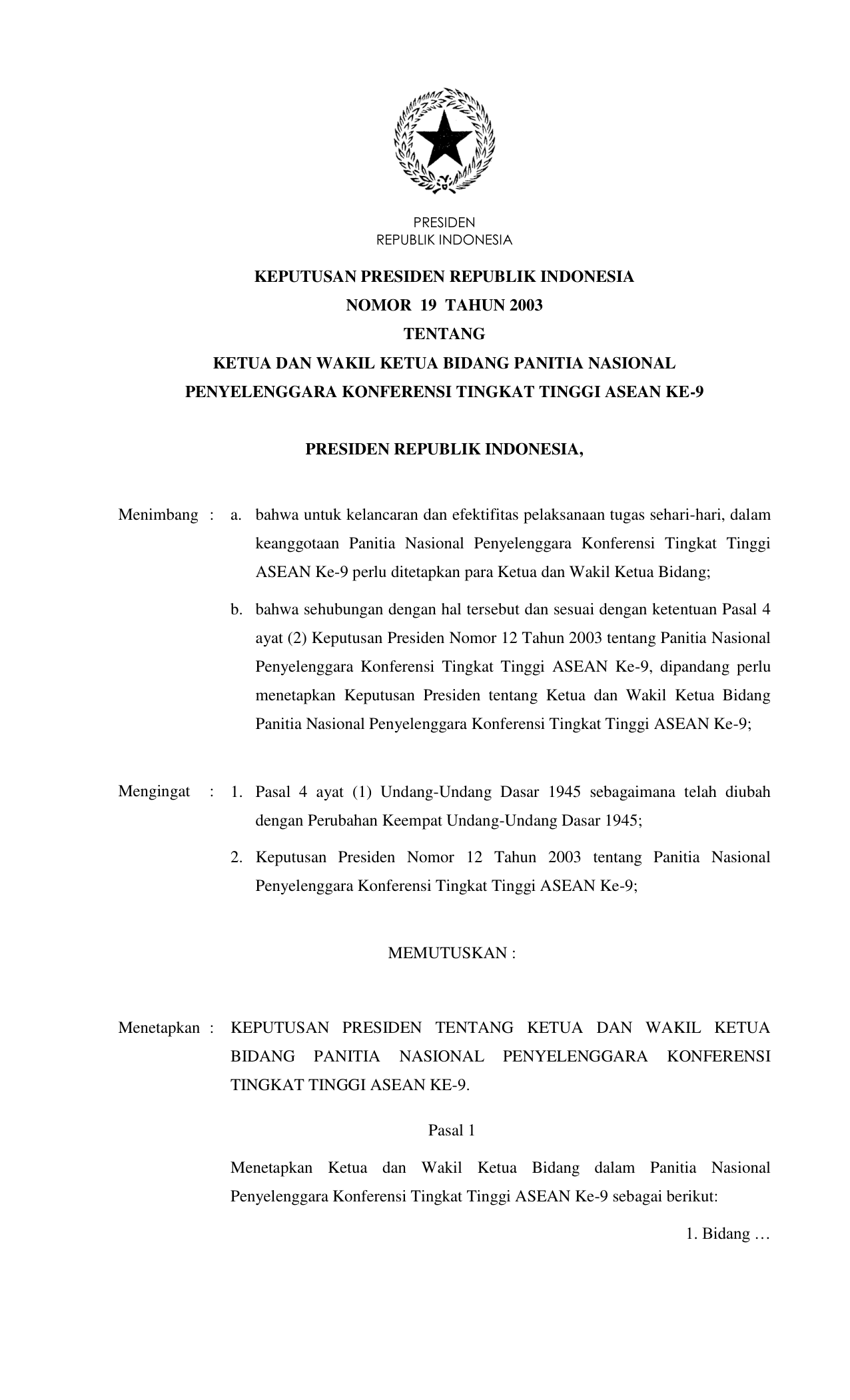 KEPPRES Nomor 19 Tahun 2003 | Keputusan Presiden Nomor 19 Tahun 2003 tentang KETUA DAN WAKIL KETUA BIDANG PANITIA NASIONAL PENYELENGGARA KONFERENSI TINGKAT TINGGI ASEAN KE-9