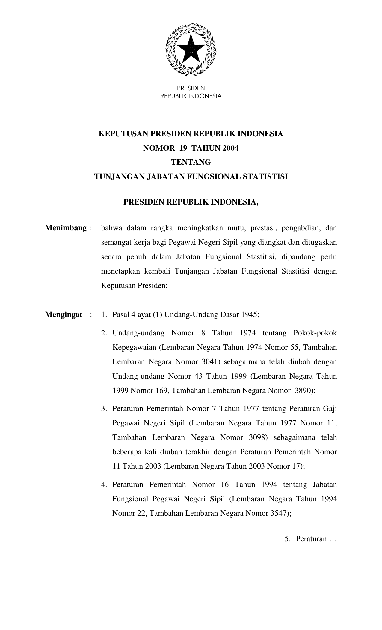 KEPPRES Nomor 19 Tahun 2004 | Keputusan Presiden Nomor 19 Tahun 2004 tentang TUNJANGAN JABATAN FUNGSIONAL STATISTISI