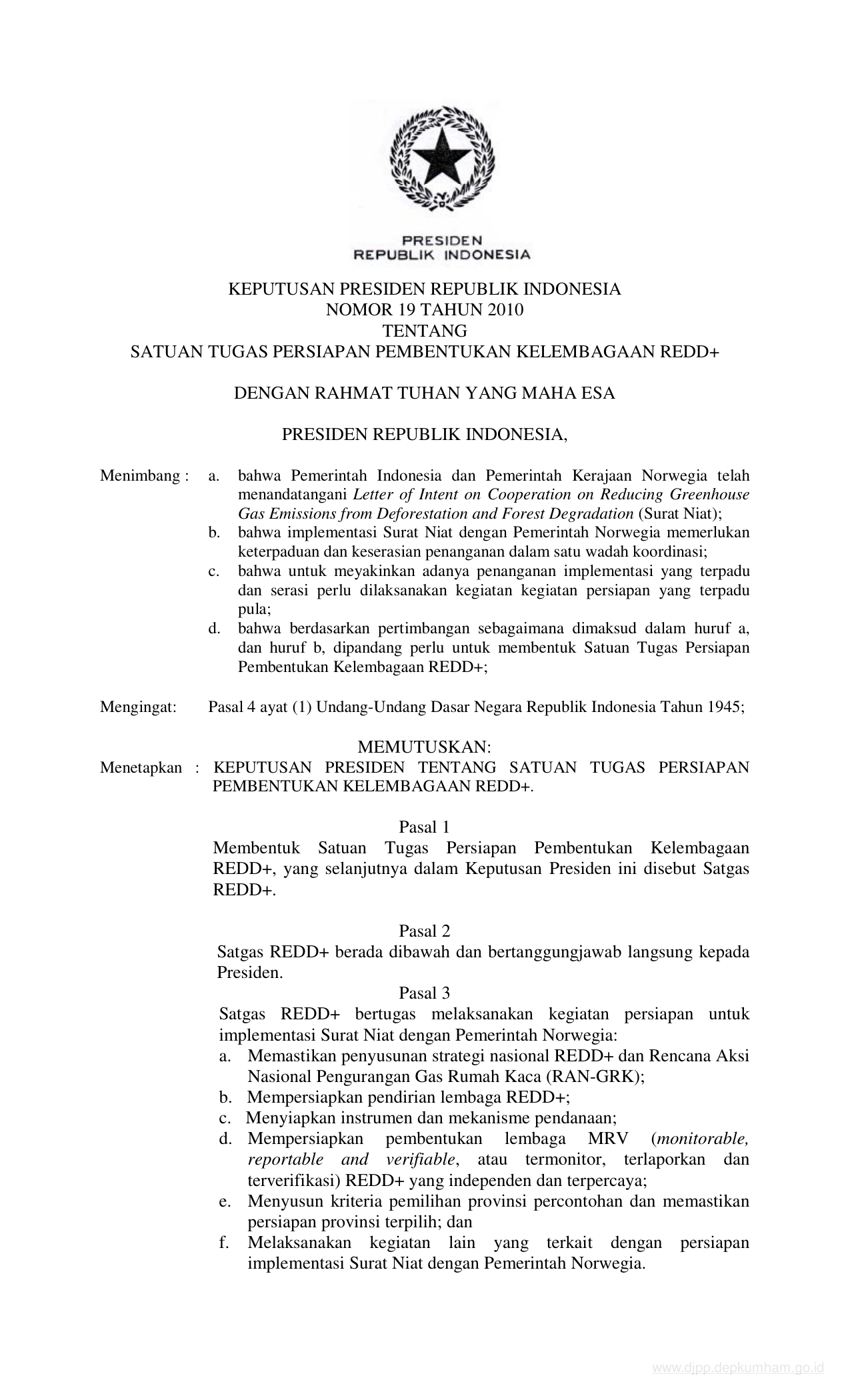 KEPPRES Nomor 19 Tahun 2010 | Keputusan Presiden Nomor 19 Tahun 2010 tentang SATUAN TUGAS PERSIAPAN PEMBENTUKAN KELEMBAGAAN REDD