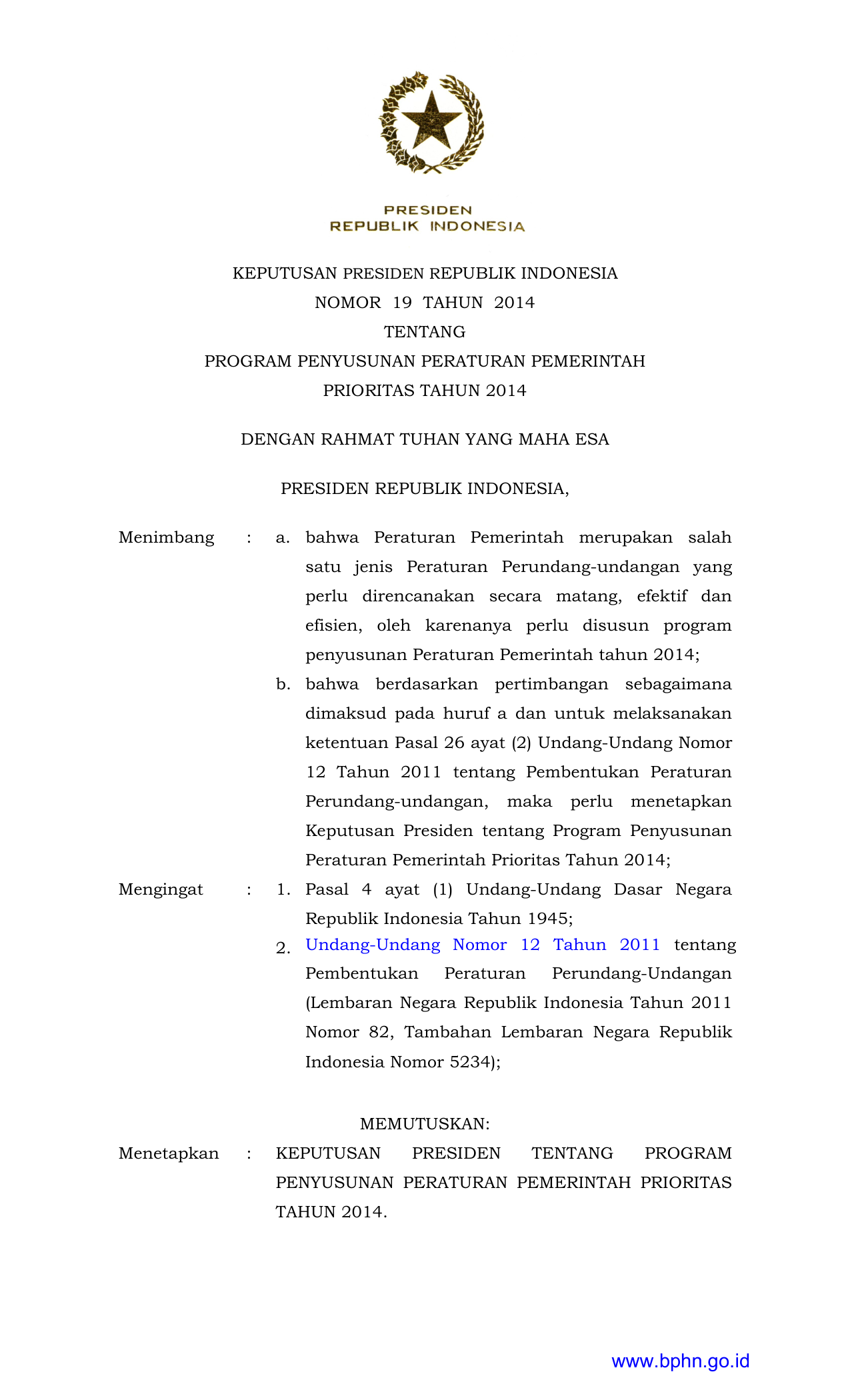 KEPPRES Nomor 19 Tahun 2014 | Keputusan Presiden Nomor 19 Tahun 2014 tentang PROGRAM PENYUSUNAN PERATURAN PEMERINTAH PRIORITAS TAHUN 2014