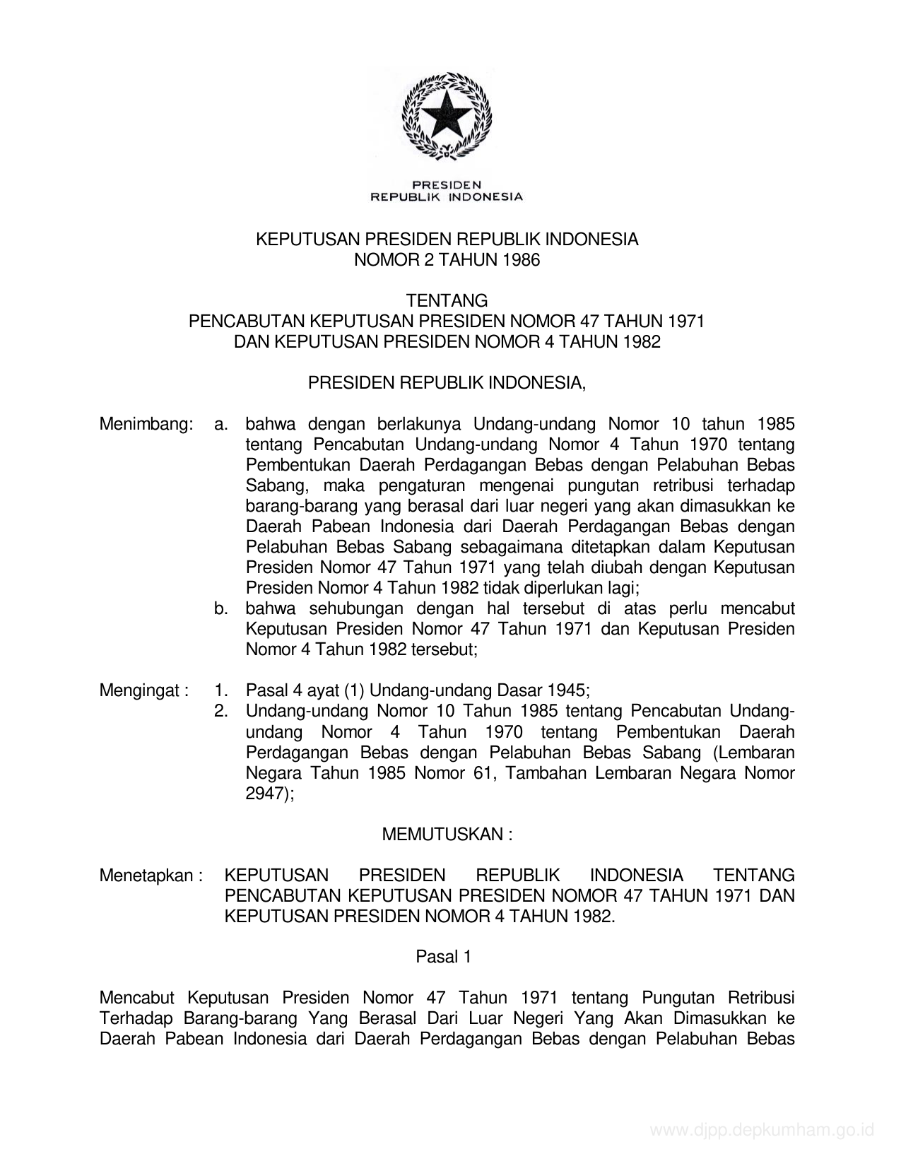 KEPPRES Nomor 2 Tahun 1986 | Keputusan Presiden Nomor 2 Tahun 1986 tentang PENCABUTAN KEPUTUSAN PRESIDEN NOMOR 47 TAHUN 1971 DAN KEPUTUSAN PRESIDEN NOMOR 4 TAHUN 1982