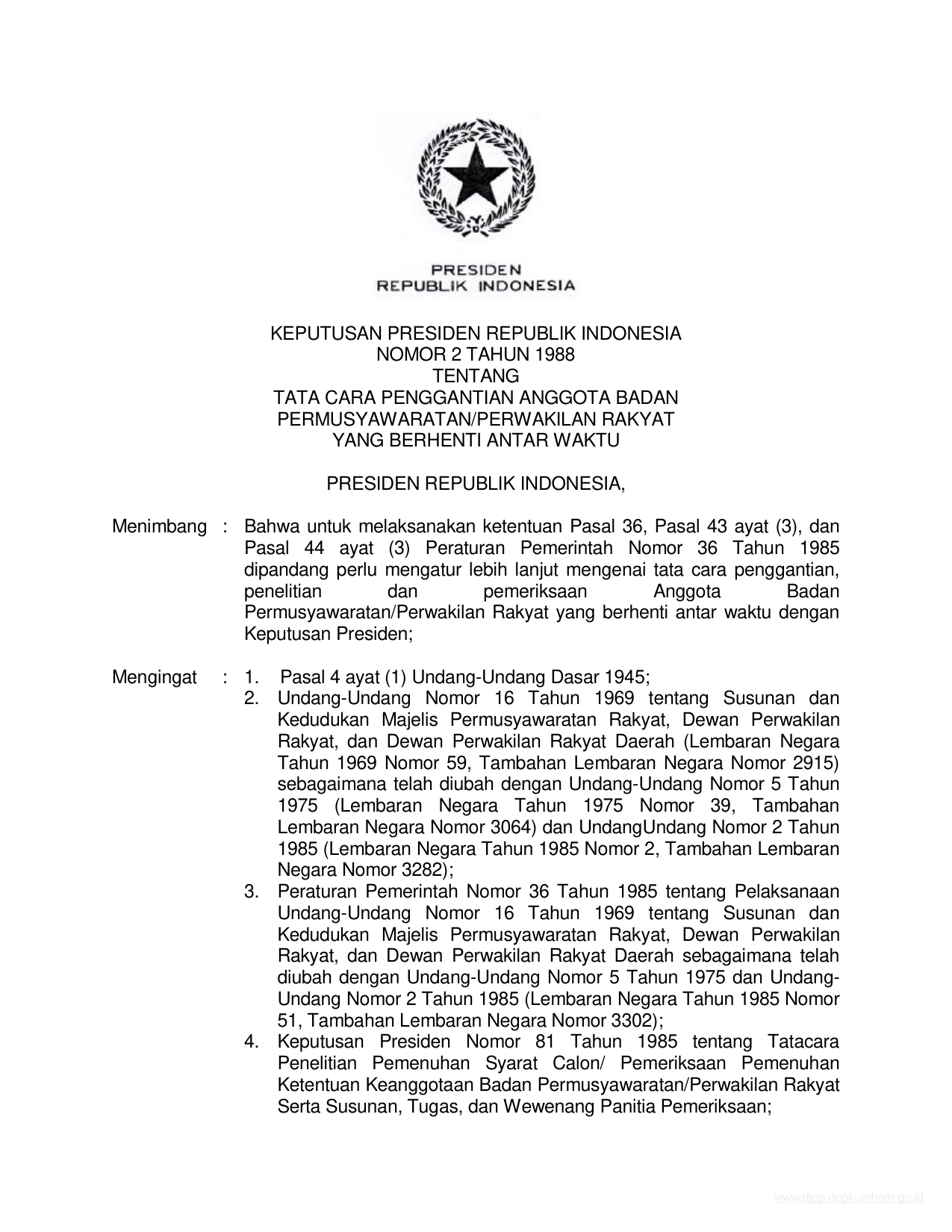 KEPPRES Nomor 2 Tahun 1988 | Keputusan Presiden Nomor 2 Tahun 1988 tentang TATA CARA PENGGANTIAN ANGGOTA BADAN PERMUSYAWARATAN/PERWAKILAN ANGGOTA BADAN PERMUSYAWARATAN RAKYAT YANG BERHENTI ANTAR WAKTU