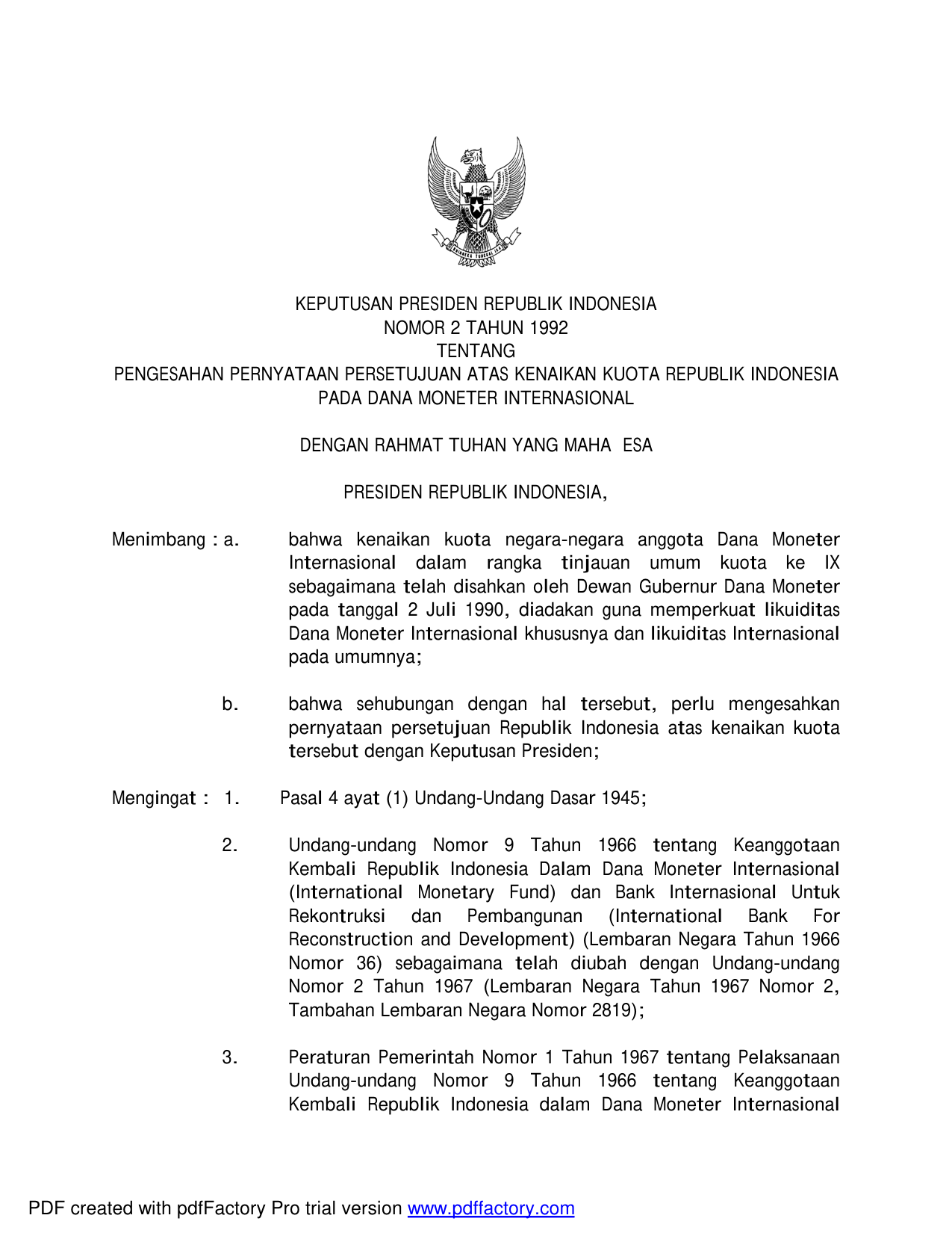 KEPPRES Nomor 2 Tahun 1992 | Keputusan Presiden Nomor 2 Tahun 1992 tentang PENGESAHAN PERNYATAAN PERSETUJUAN ATAS KENAIKAN KUOTA RI PADA DANA MONETER INTERNASIONAL