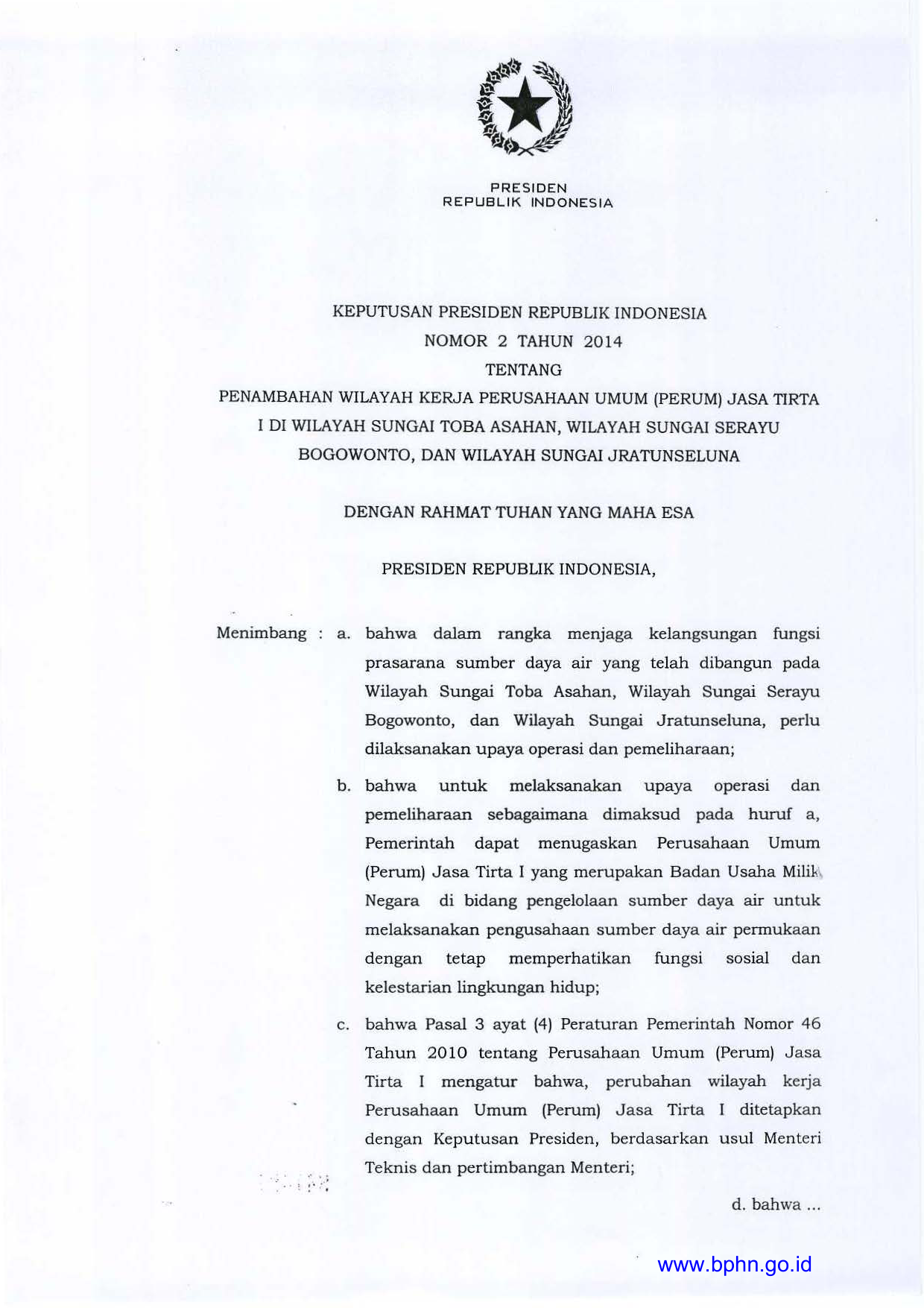 KEPPRES Nomor 2 Tahun 2014 | Keputusan Presiden Nomor 2 Tahun 2014 tentang PENAMBAHAN WILAYAH KERJA PERUSAHAAN UMUM (PERUM) JASA TIRTA I DI WILAYAH SUNGAI TOBA ASAHAN, WILAYAH SUNGAI SERAYU BOGOWONTO, DAN WILAYAH SUNGAI JRATUNSELUNA