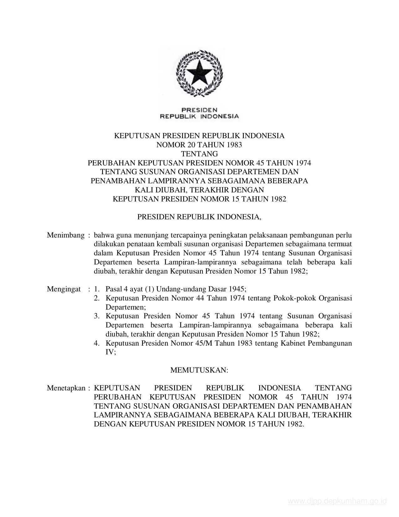 KEPPRES Nomor 20 Tahun 1983 | Keputusan Presiden Nomor 20 Tahun 1983 tentang PERUBAHAN KEPUTUSAN PRESIDEN NOMOR 45 TAHUN 1974 TENTANG SUSUNAN ORGANISASI DEPERTEMEN DAN PENAMBAHAN LAMPIRANNYA