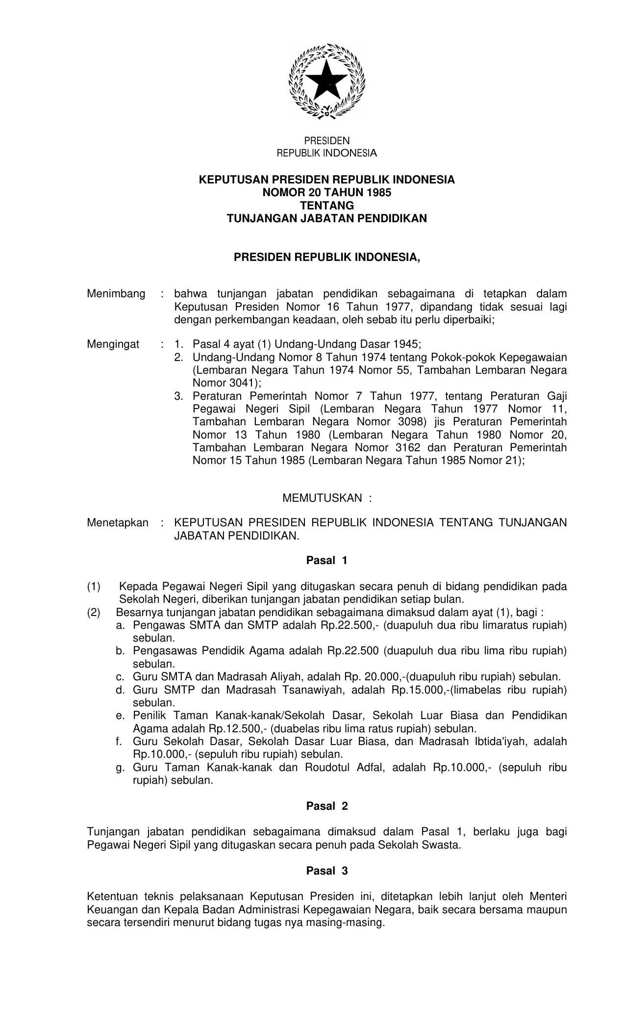 KEPPRES Nomor 20 Tahun 1985 | Keputusan Presiden Nomor 20 Tahun 1985 tentang TUNJANGAN JABATAN PENDIDIKAN