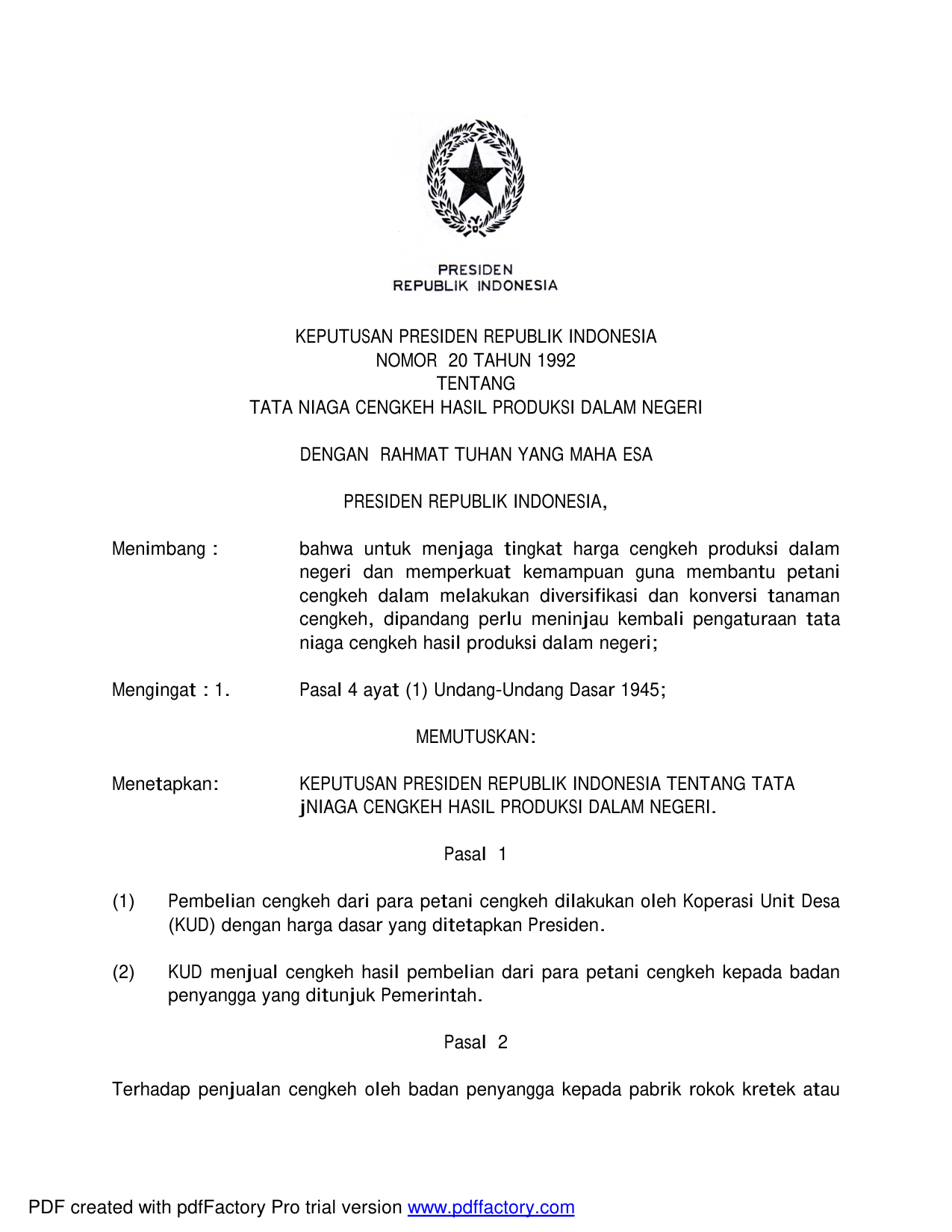 KEPPRES Nomor 20 Tahun 1992 | Keputusan Presiden Nomor 20 Tahun 1992 tentang TATA NIAGA CENGKEH HASIL PRODUKSI DALAM NEGERI