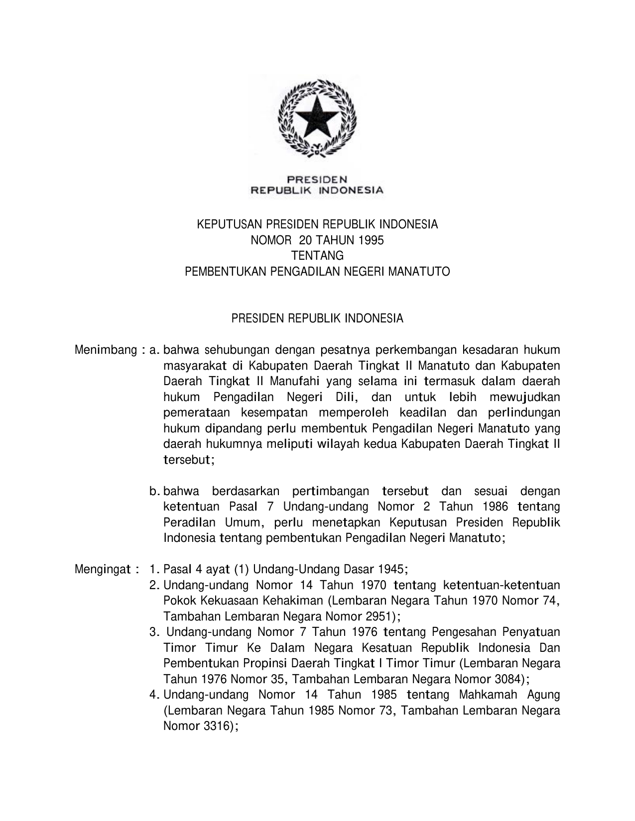 KEPPRES Nomor 20 Tahun 1995 | Keputusan Presiden Nomor 20 Tahun 1995 tentang PEMBENTUKAN PENGADILAN NEGERI MANATUTO