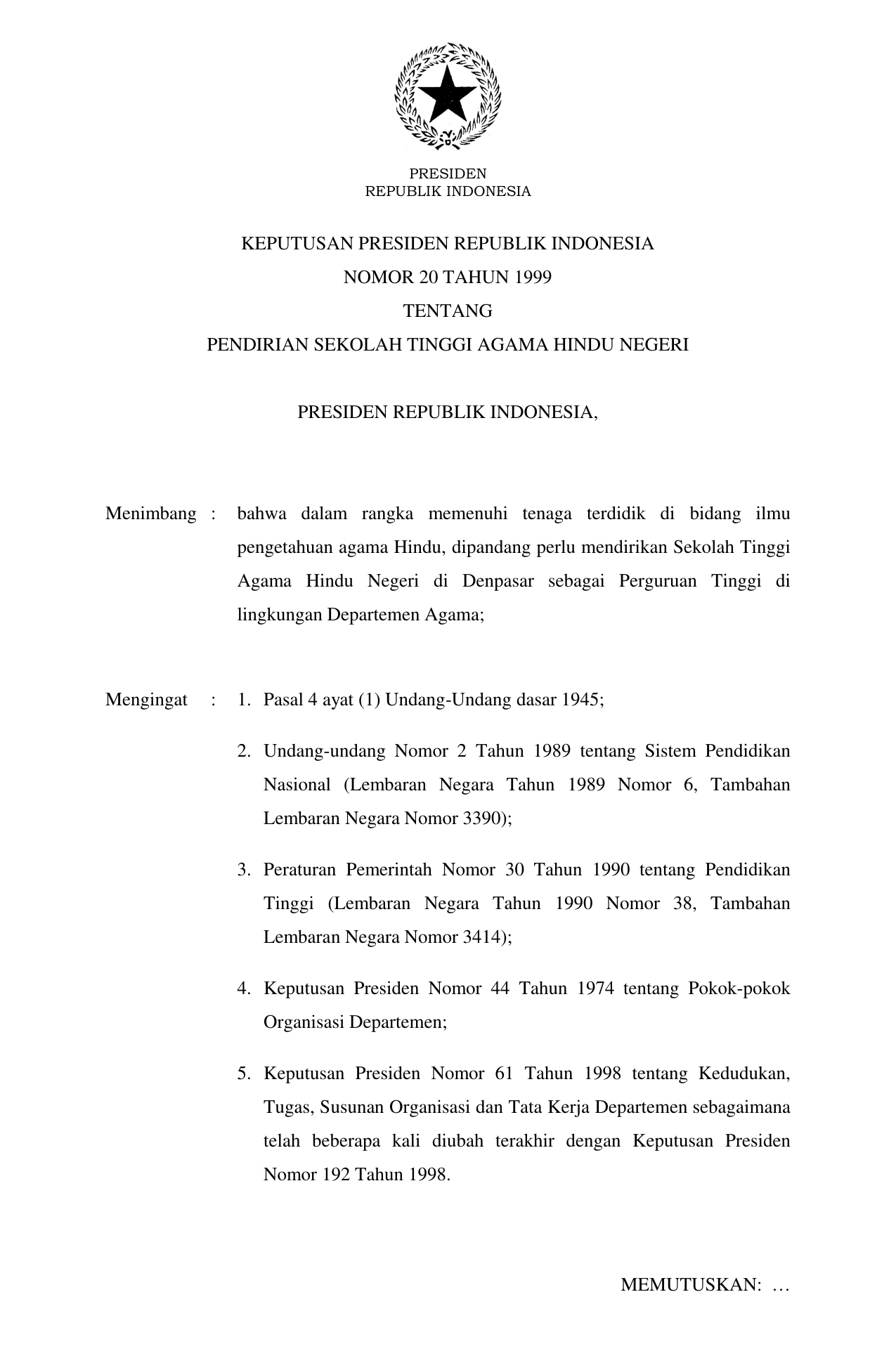 KEPPRES Nomor 20 Tahun 1999 | Keputusan Presiden Nomor 20 Tahun 1999 tentang PENDIRIAN SEKOLAH TINGGI AGAMA HINDU NEGERI