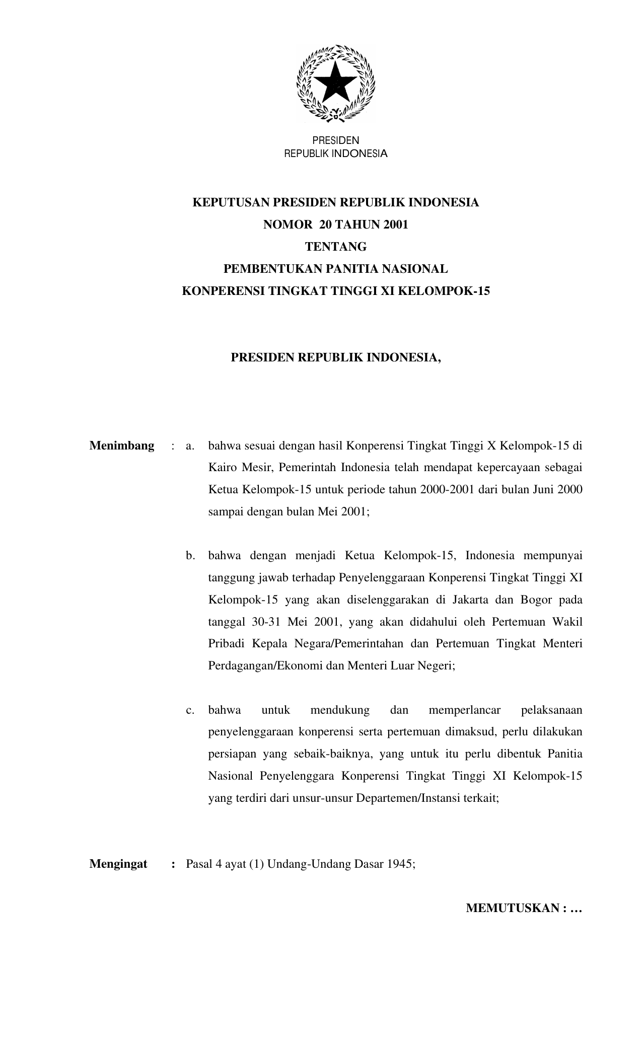 KEPPRES Nomor 20 Tahun 2001 | Keputusan Presiden Nomor 20 Tahun 2001 tentang PEMBENTUKAN PANITIA NASIONAL KONFERENSI TINGKAT TINGGI XI KELOMPOK 15