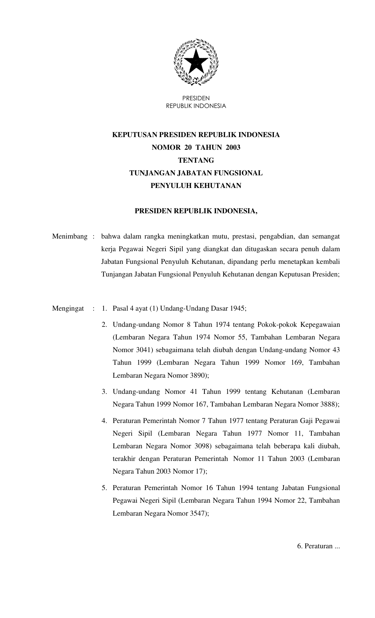 KEPPRES Nomor 20 Tahun 2003 | Keputusan Presiden Nomor 20 Tahun 2003 tentang TUNJANGAN JABATAN FUNGSIONAL PENYULUH KEHUTANAN