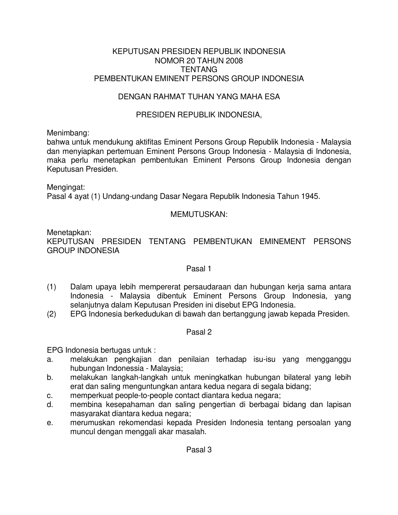 KEPPRES Nomor 20 Tahun 2008 | Keputusan Presiden Nomor 20 Tahun 2008 tentang PEMBENTUKAN EMINENT PERSON GROUP INDONESIA