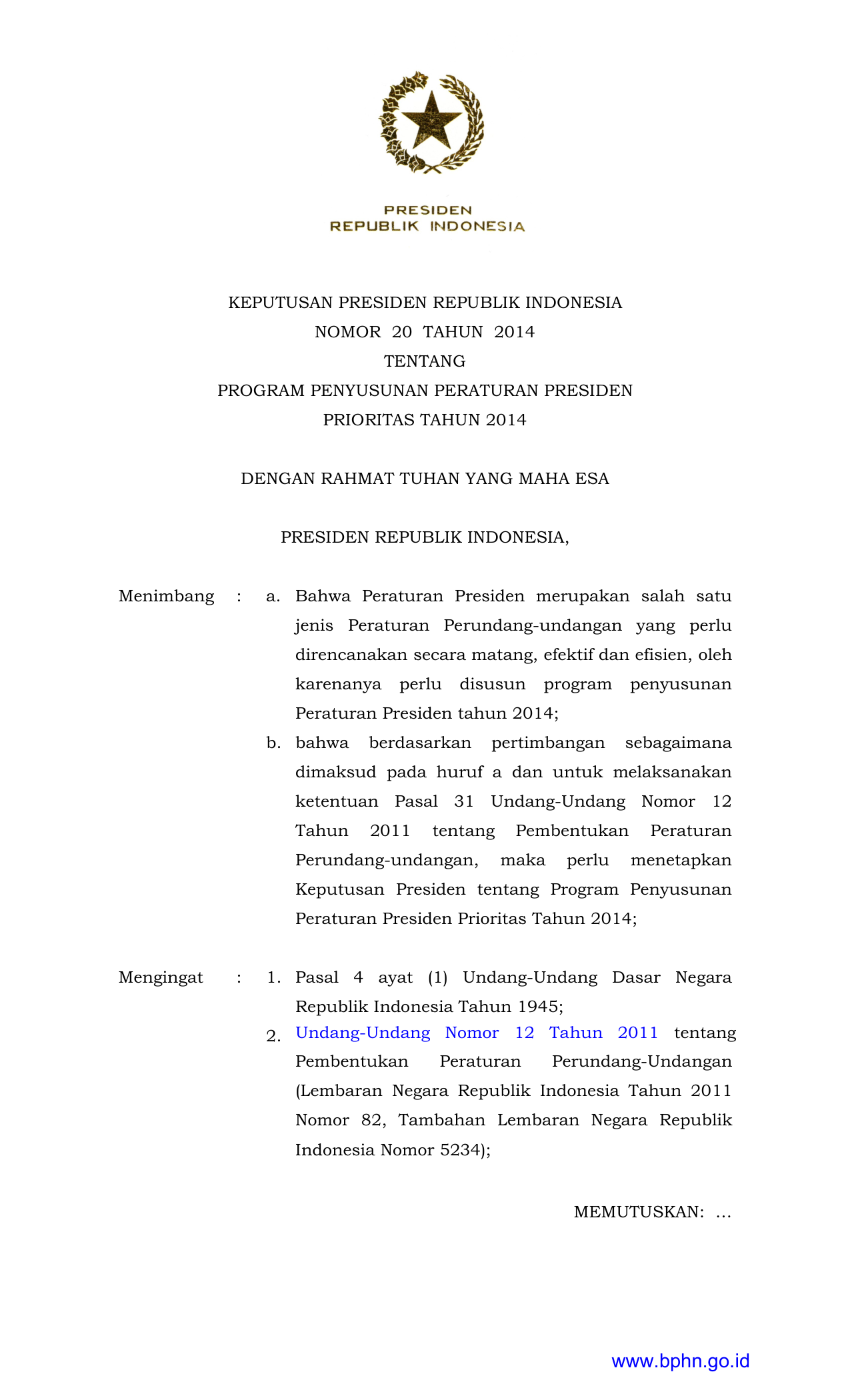 KEPPRES Nomor 20 Tahun 2014 | Keputusan Presiden Nomor 20 Tahun 2014 tentang PROGRAM PENYUSUNAN PERATURAN PRESIDEN PRIORITAS TAHUN 2014