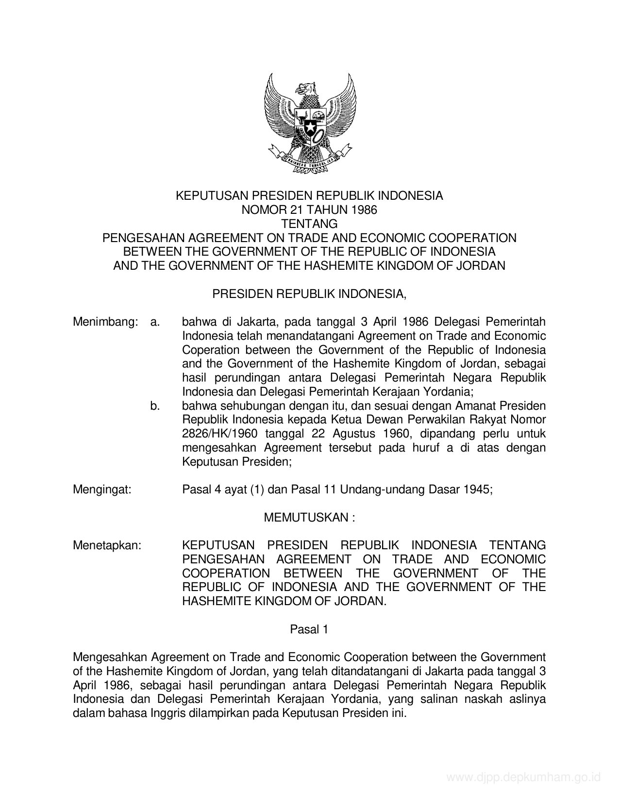 KEPPRES Nomor 21 Tahun 1986 | Keputusan Presiden Nomor 21 Tahun 1986 tentang PENGESAHAN AGREEMENT ON TRADE AND ECONOMIC COOPERATION BETWEEN THE GEVERMENT OF THE REPUBLIC OF INDONESIA AND THE GOVERMENT OF THE HASHEMITE KINGDOM OF JORDAN