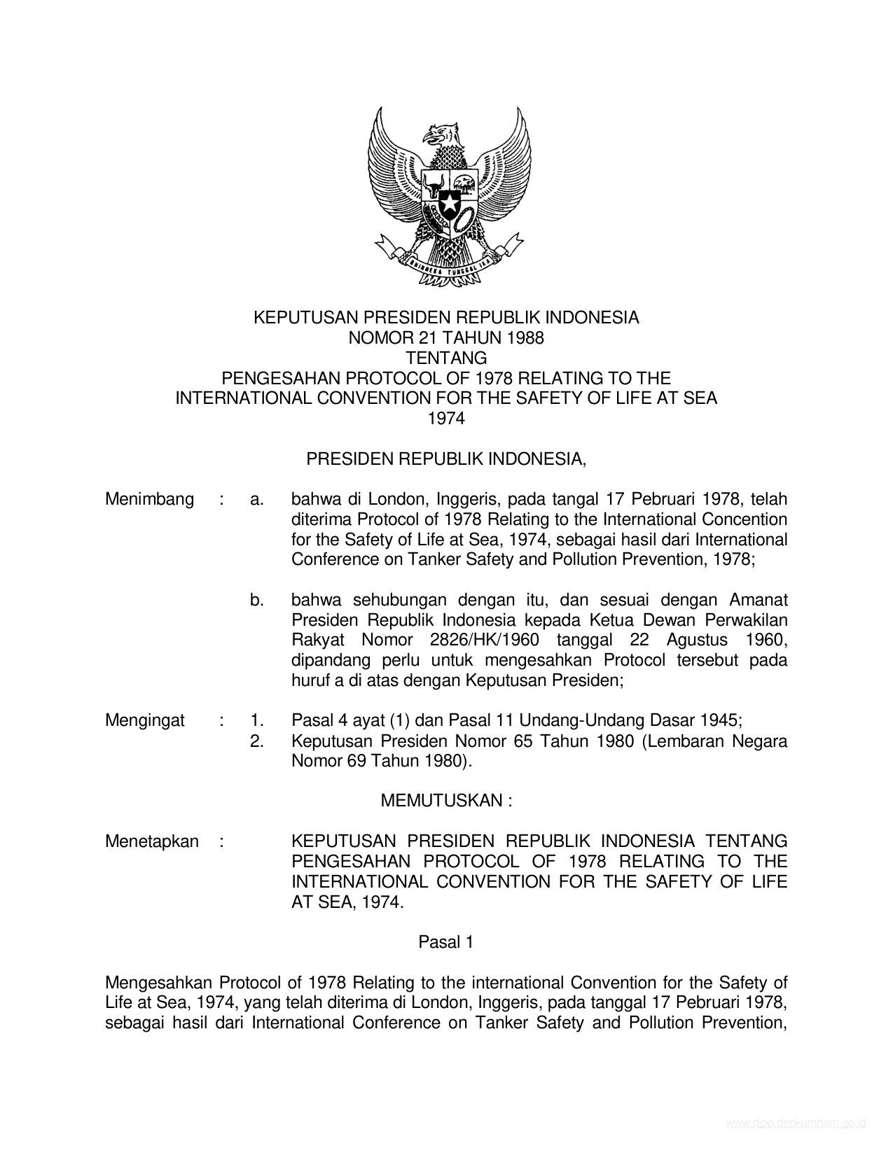 KEPPRES Nomor 21 Tahun 1988 | Keputusan Presiden Nomor 21 Tahun 1988 tentang PENGESAHAN PROTOCOL OF 1978, RELATING TO THE INTERNATIONAL CONVENTION FOR THE SAFETY OF LIFE AT SEA, 1974