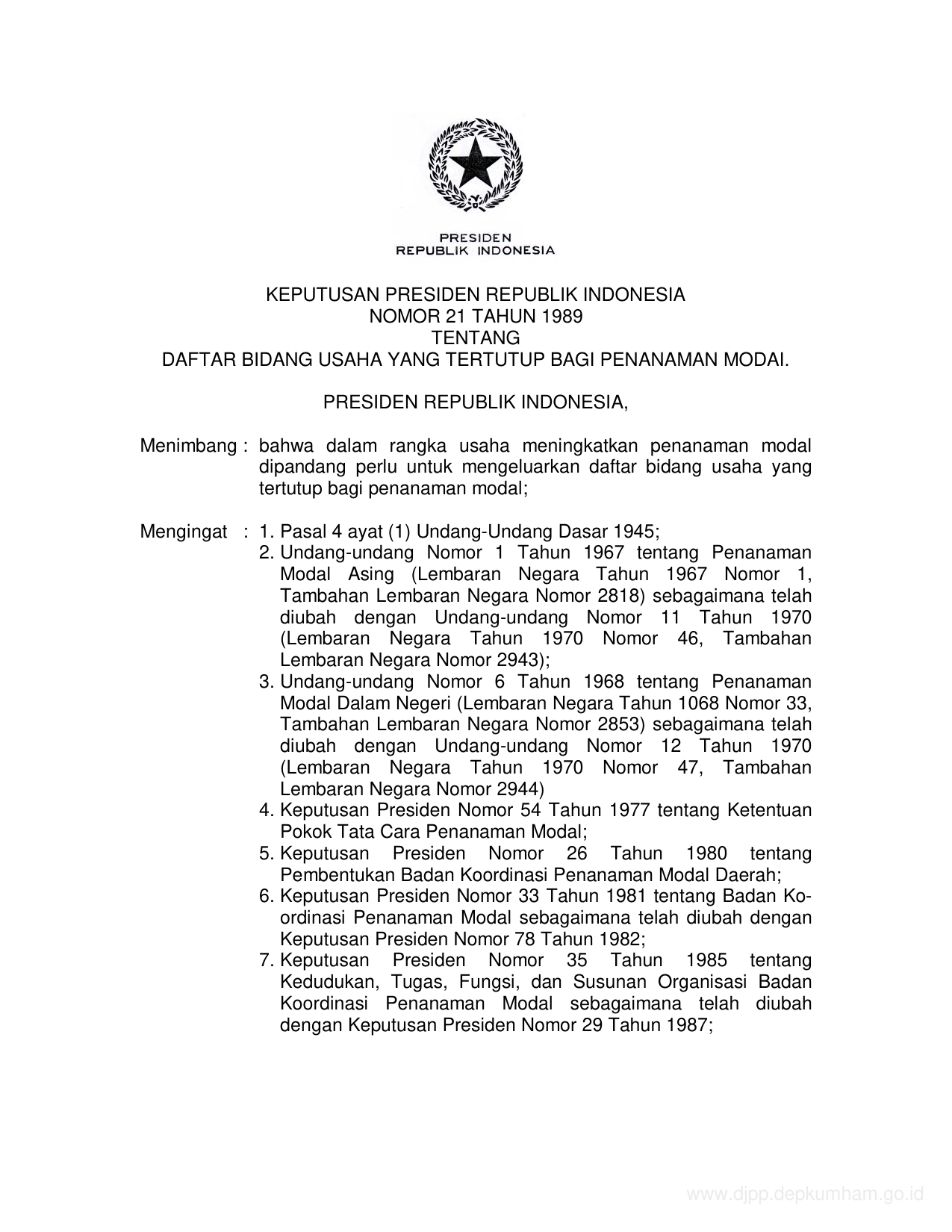 KEPPRES Nomor 21 Tahun 1989 | Keputusan Presiden Nomor 21 Tahun 1989 tentang DAFTAR BIDANG USAHA YANG TERTUTUP BAGI PENANAMAN MODAL