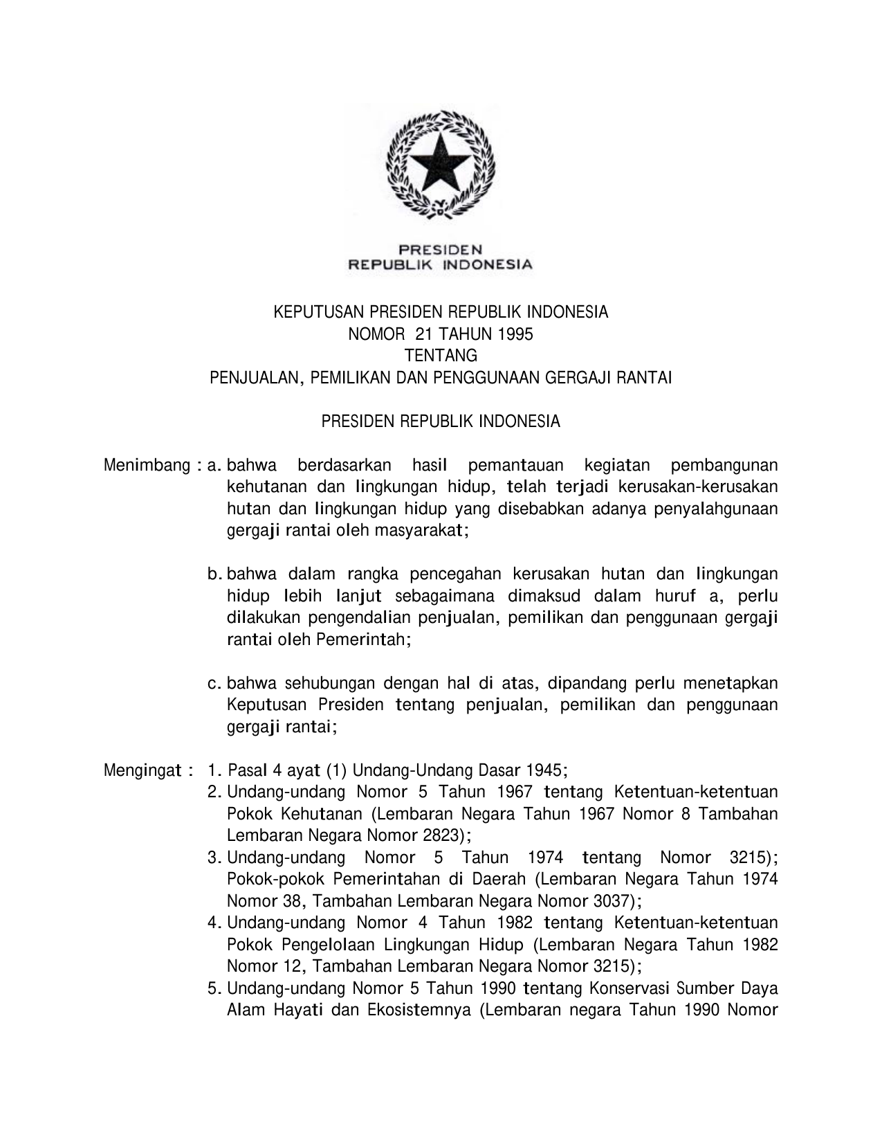 KEPPRES Nomor 21 Tahun 1995 | Keputusan Presiden Nomor 21 Tahun 1995 tentang PENJUALAN, PEMILIKAN DAN PENGGUNAAN GERGAJI RANTAI