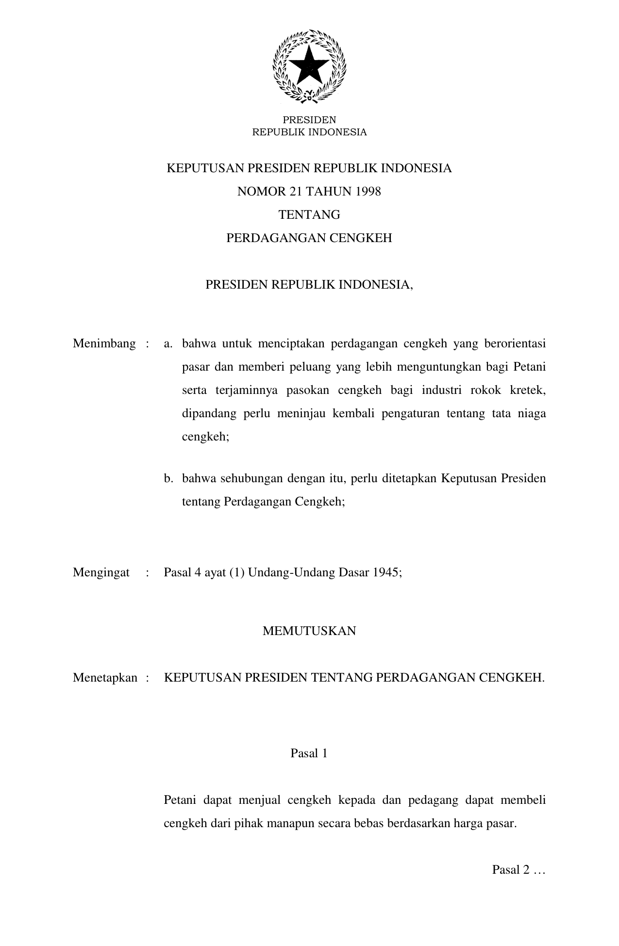 KEPPRES Nomor 21 Tahun 1998 | Keputusan Presiden Nomor 21 Tahun 1998 tentang PERDAGANGAN CENGKEH