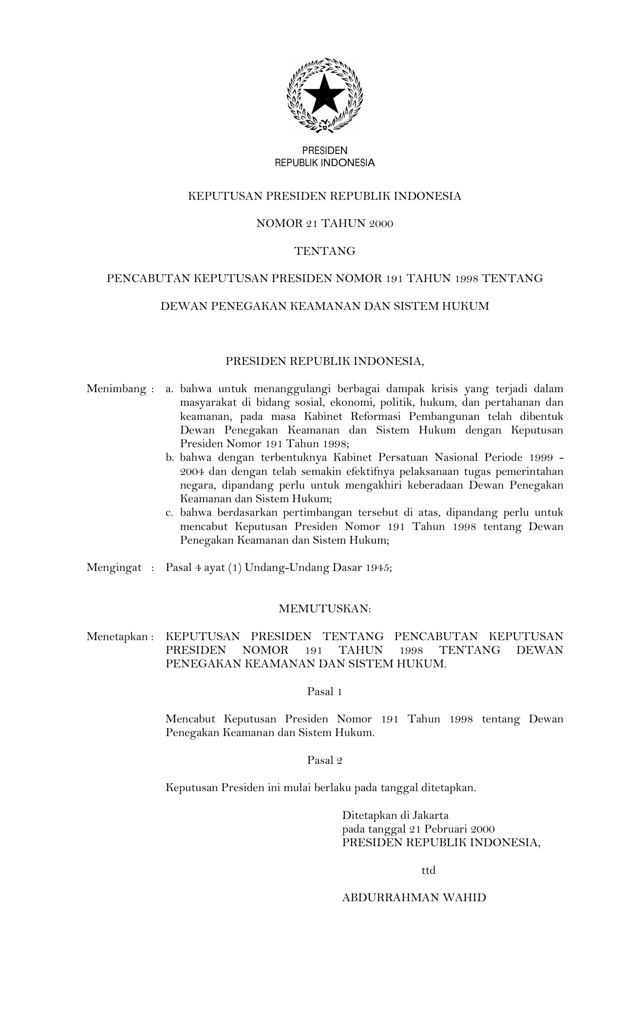 KEPPRES Nomor 21 Tahun 2000 | Keputusan Presiden Nomor 21 Tahun 2000 tentang PENCABUTAN KEPPRES NOMOR 191 TAHUN 1998 TENTANG DEWAN PENEGAKAN KEAMANAN DAN SISTEM HUKUM