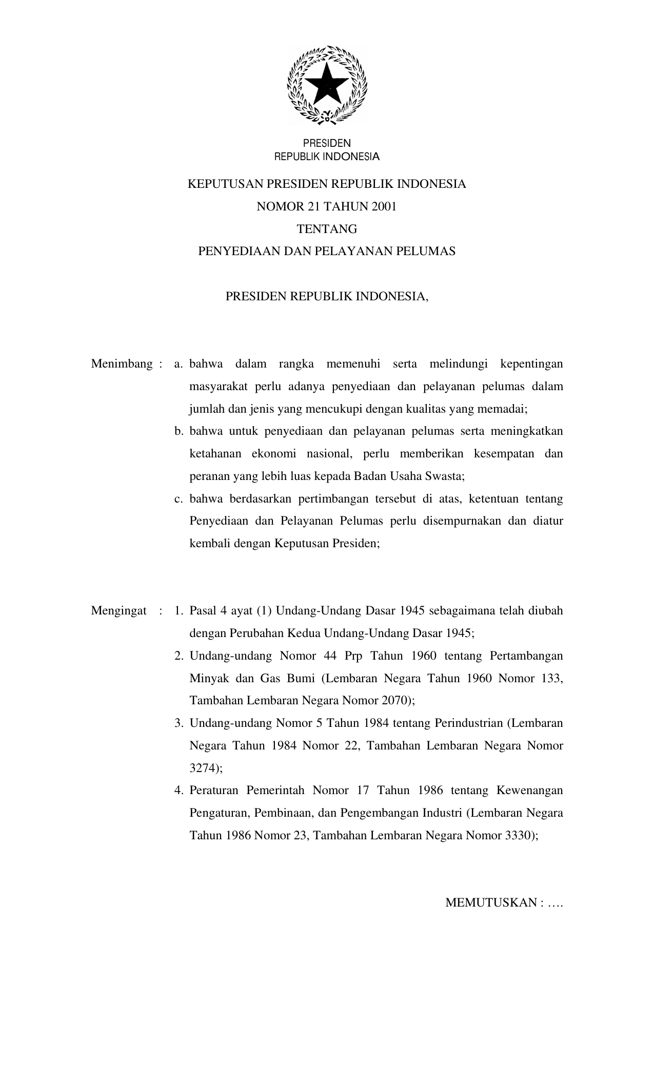 KEPPRES Nomor 21 Tahun 2001 | Keputusan Presiden Nomor 21 Tahun 2001 tentang PENYEDIAAN DAN PELAYANAN PELUMAS