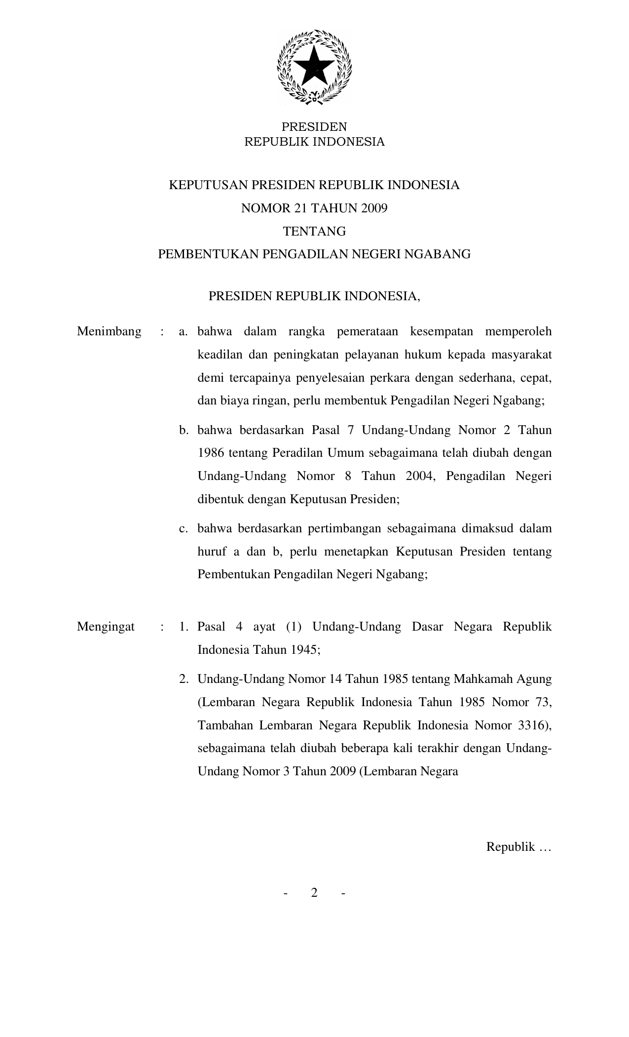 KEPPRES Nomor 21 Tahun 2009 | Keputusan Presiden Nomor 21 Tahun 2009 tentang PEMBENTUKAN PENGADILAN NEGERI NGABANG