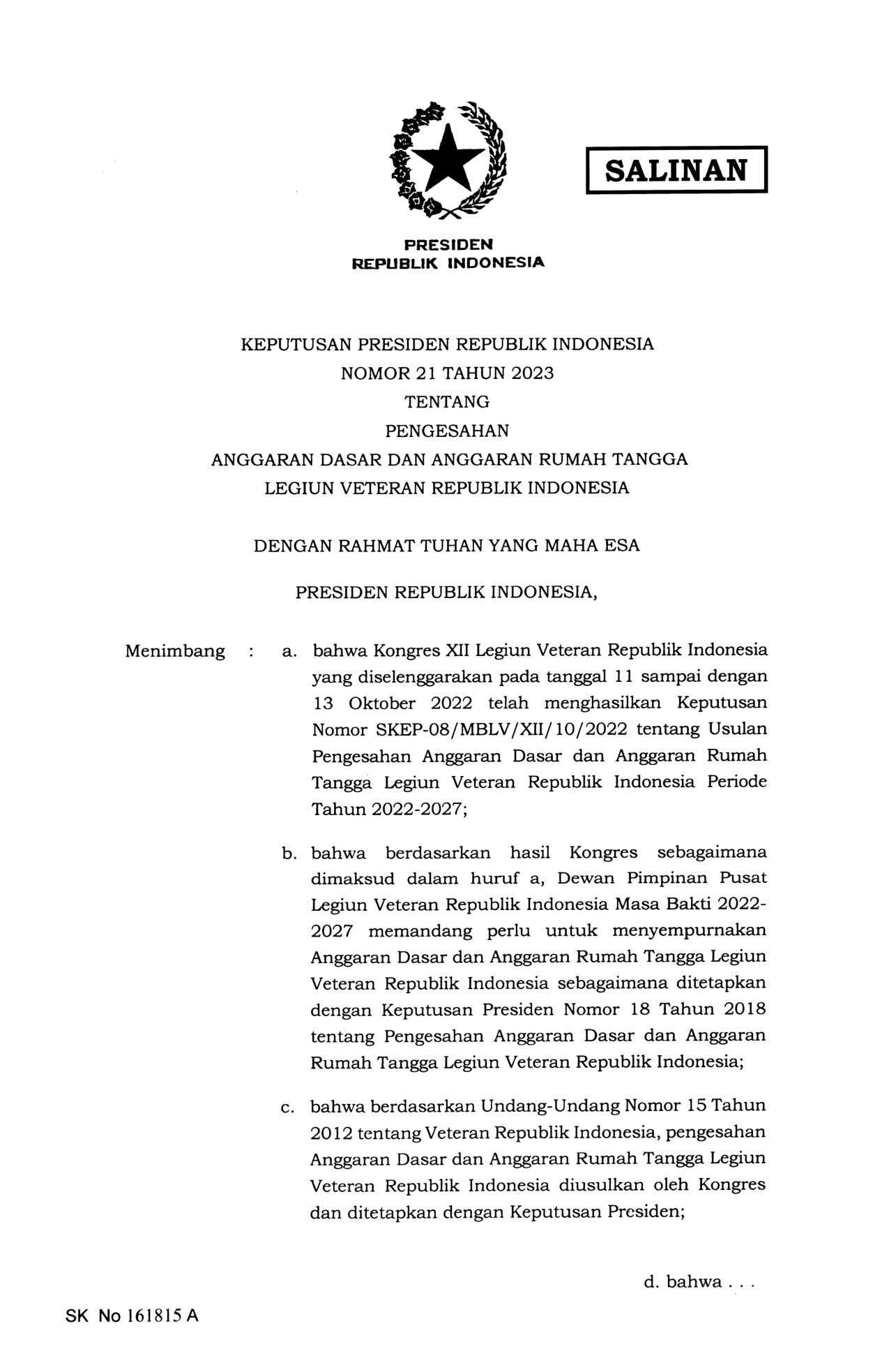KEPPRES Nomor 21 Tahun 2023 | Keputusan Presiden Nomor 21 Tahun 2023 tentang PENGESAHAN ANGGARAN DASAR DAN ANGGARAN RUMAH TANGGA LEGIUN VETERAN REPUBLIK INDONESIA