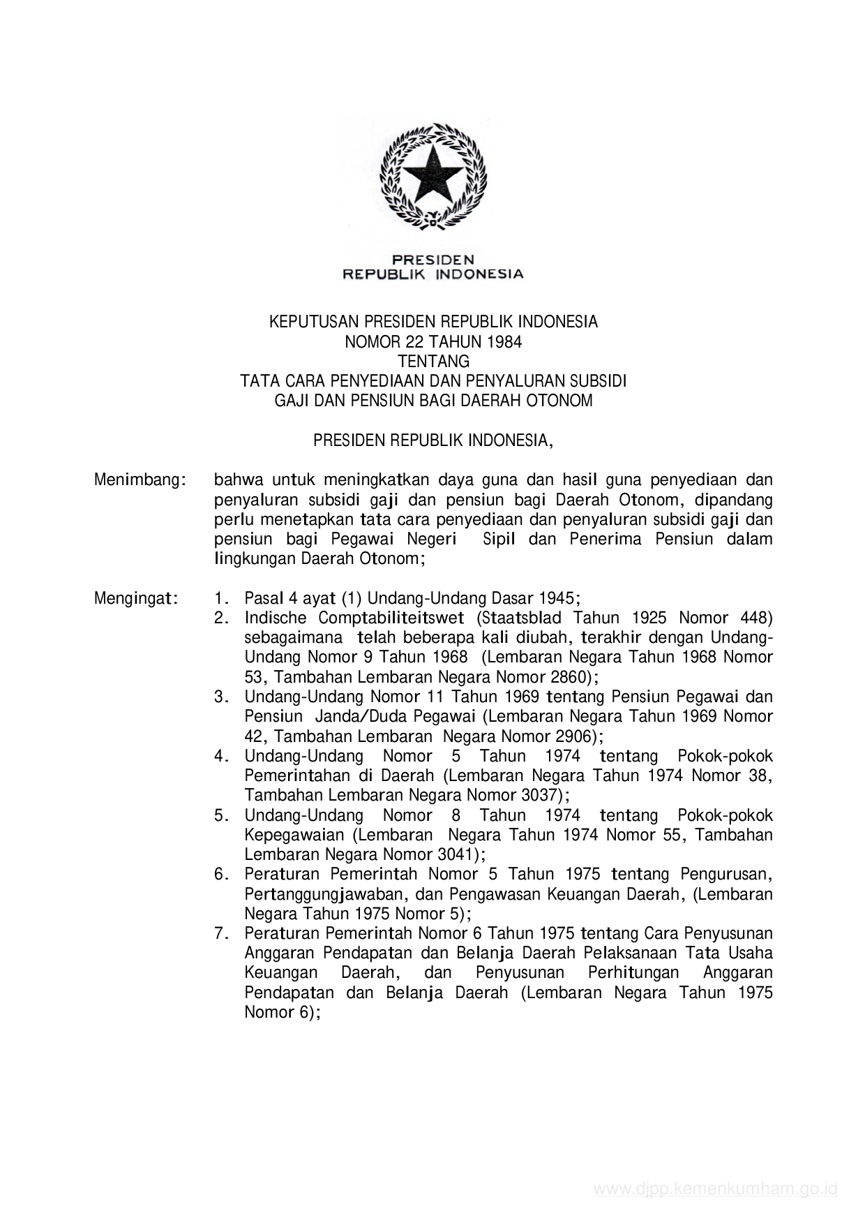 KEPPRES Nomor 22 Tahun 1984 | Keputusan Presiden Nomor 22 Tahun 1984 tentang TATA CARA PENYEDIAAN DAN PENYALURAN GAJI DAN PENSIUN BAGI DAERAH OTONOM