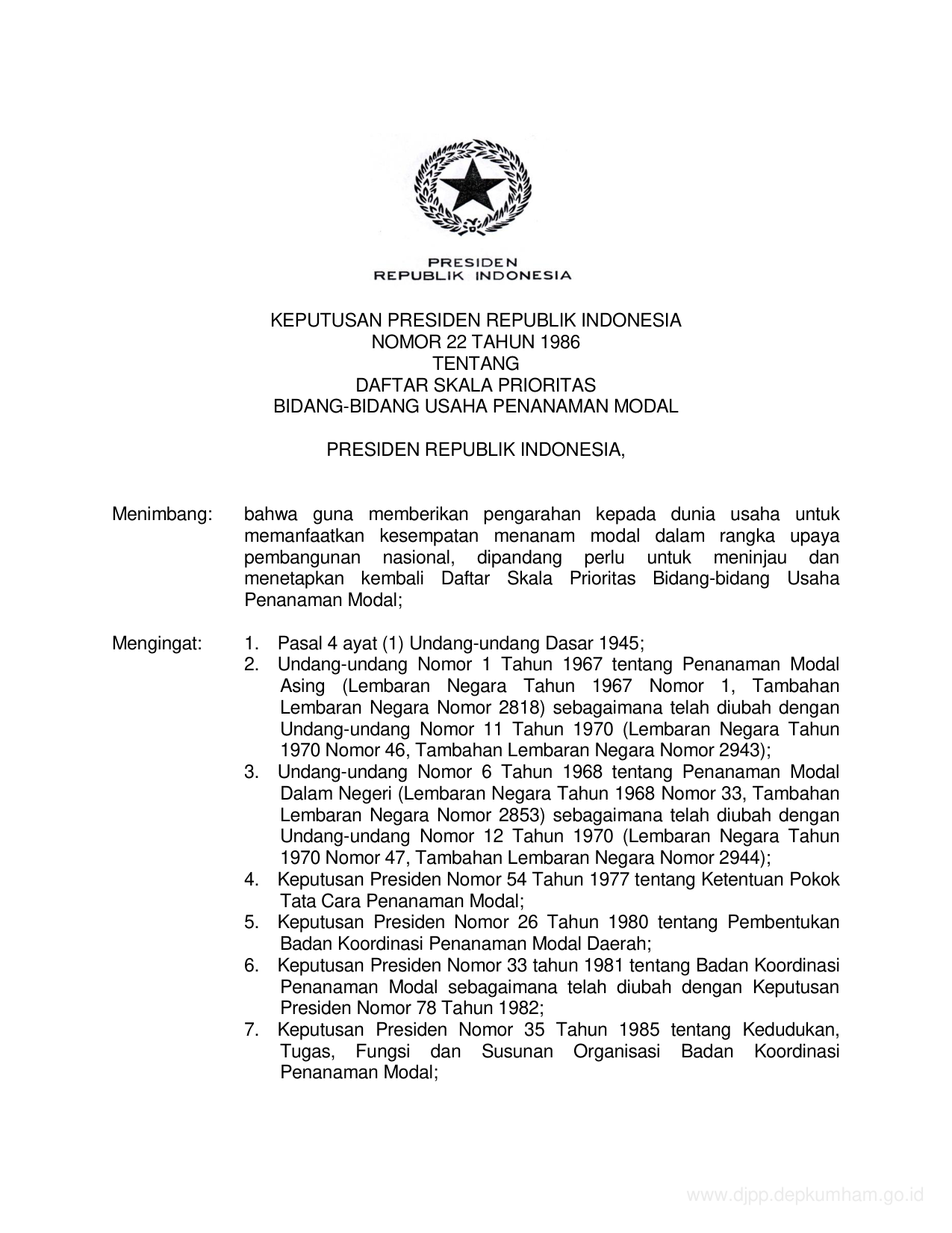 KEPPRES Nomor 22 Tahun 1986 | Keputusan Presiden Nomor 22 Tahun 1986 tentang DAFTAR SKALA PRIORITAS BIDANG-BIDANG USAHA PENANAMAN MODAL