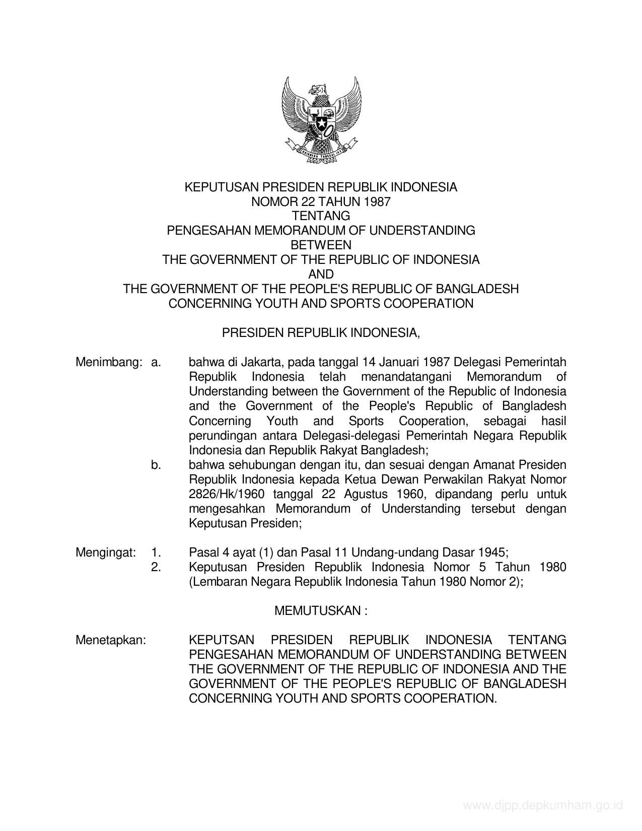 KEPPRES Nomor 22 Tahun 1987 | Keputusan Presiden Nomor 22 Tahun 1987 tentang PENGESAHAN MEMORANDUM OF UNDERSTANDING BETWEEN THE GOVERNMENT OF THE REPUBLIK OF INDONESIA AND THE GOVERNMENT OF THE PEOPLE'S REPUBLIK OF BANGLADES CONCERNING YOUTH AND SPORT COOPERATION