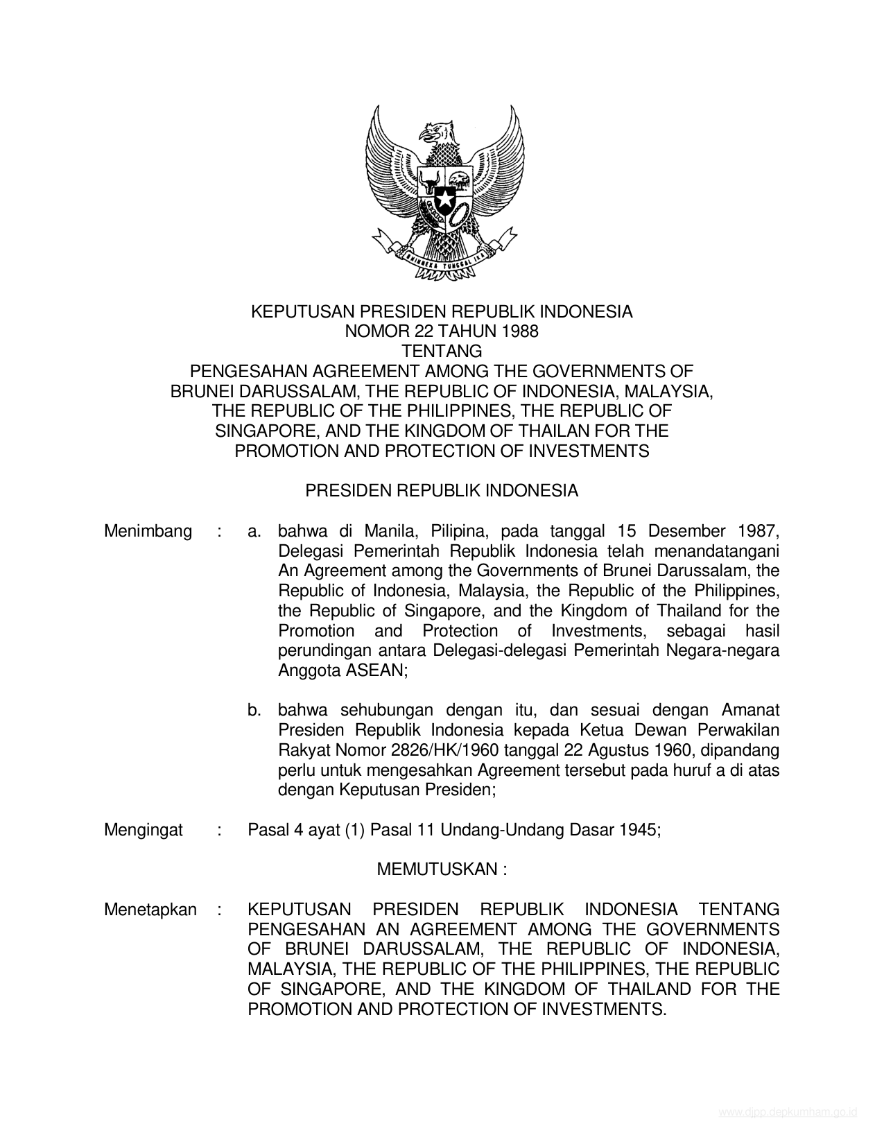 KEPPRES Nomor 22 Tahun 1988 | Keputusan Presiden Nomor 22 Tahun 1988 tentang PENGESAHAN AN AGREEMENT AMONG THE GOVERMENTS OF BRUNEI DARUSSALA, THE REPUBLIC OF INDONESIA, MALAYSIA THE REPUBLIK OF THE PHILIPINES, THE REPUBLIK OF SINGAPORE, AND THE KINGDOM OF THAILAND FOR THE PROMOTION AND PROTECTION OF INVESTMENTS